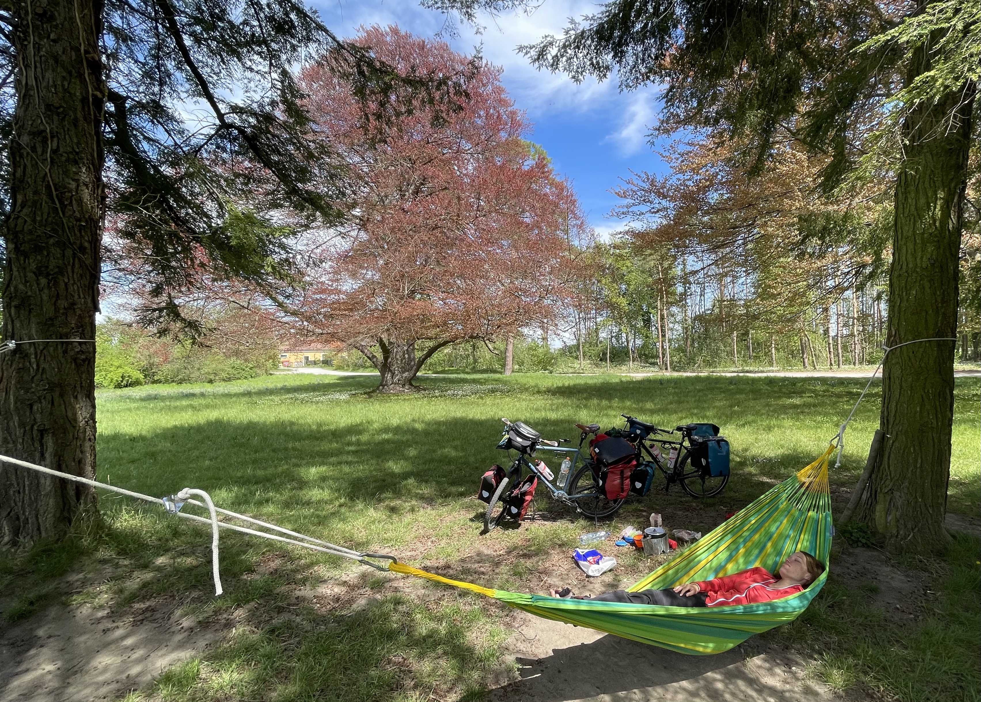 Am Abend suchten wir etwas abseits des Radweges nach einem Zeltplatz kurz vor Wien. Noch beim Zelt aufstellen sind uns diverse Wildschweinspuren in der Wiese aufgefallen, welche nicht sehr frisch aussahen. Hätten wir doch besser den Finger 👉🏻 in die 💩 gesteckt, dann hätte uns die Wärme wahrscheinlich verraten, dass die Hinterlassenschaften frischer waren als gedacht😅. Mitten in der Nacht rüttelte Nicole nämlich Beni aus dem Schlaf und flüsterte „hörst du das auch?“ Die Gesichtszüge von Beni änderten von verpeilt schlagartig auf Kampfbereitschaft, als auch er das Grunzen direkt neben unserem Zelt wahrnahm. Mit angehaltenem Atem und einem Puls von 200 harrten wir stockstarr aus bis das Wildschwein / die Wildschweine weiterzog. Mit so viel Adrenalin fanden wir in dieser Nacht keinen ruhigen Schlaf mehr. Ein seltener Anblick bot sich uns beim Verlassen des Waldes am nächsten Morgen, als wir mindestens 20 Wildschweine inkl. Jungtiere erblickten – welch ein seltener Anblick.
