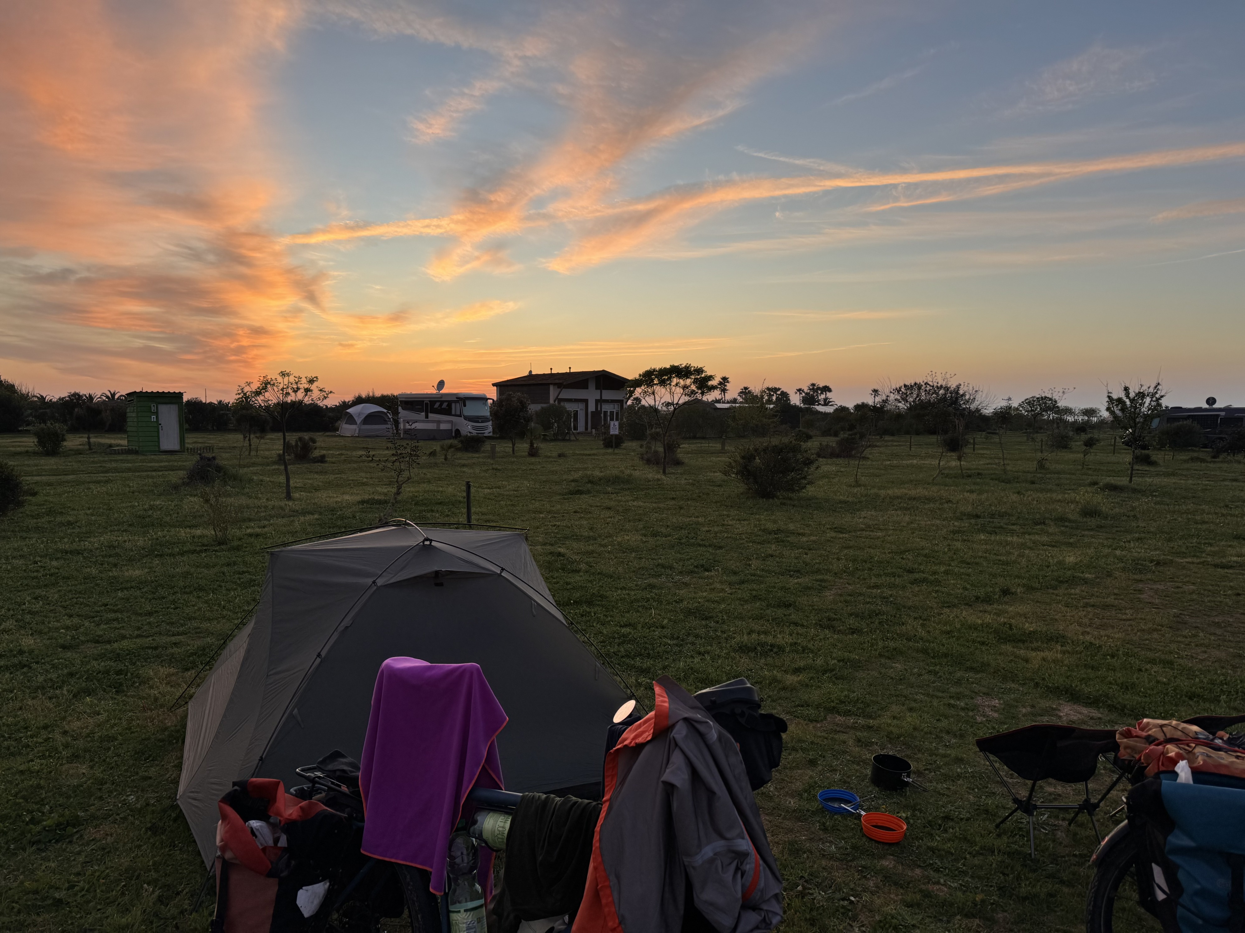 And not just any wind—but one that spins leisurely in circles… and completely drenches our tent and bikes at regular intervals 😂. You could practically count the seconds until the water jet hit us again with full force.