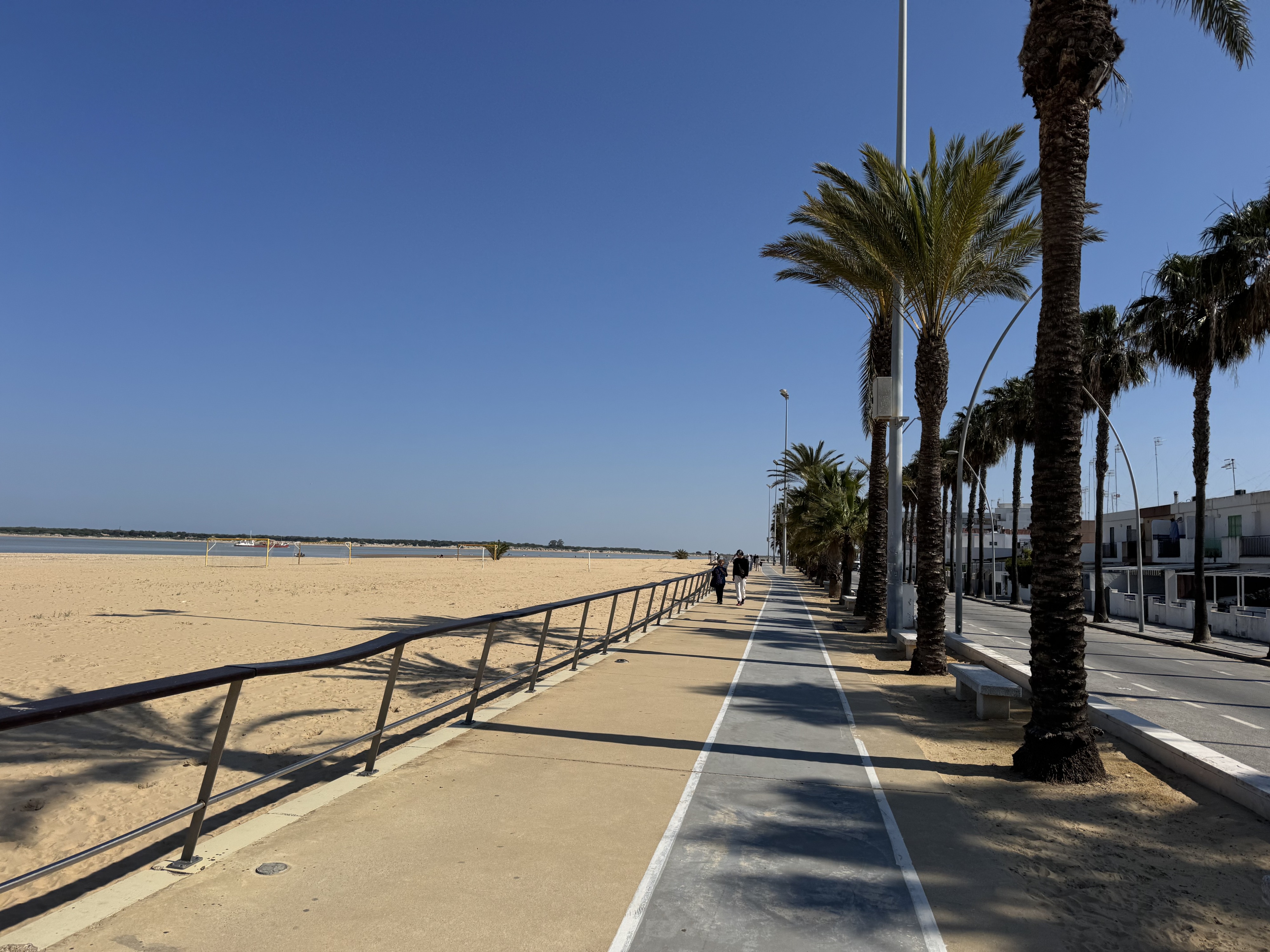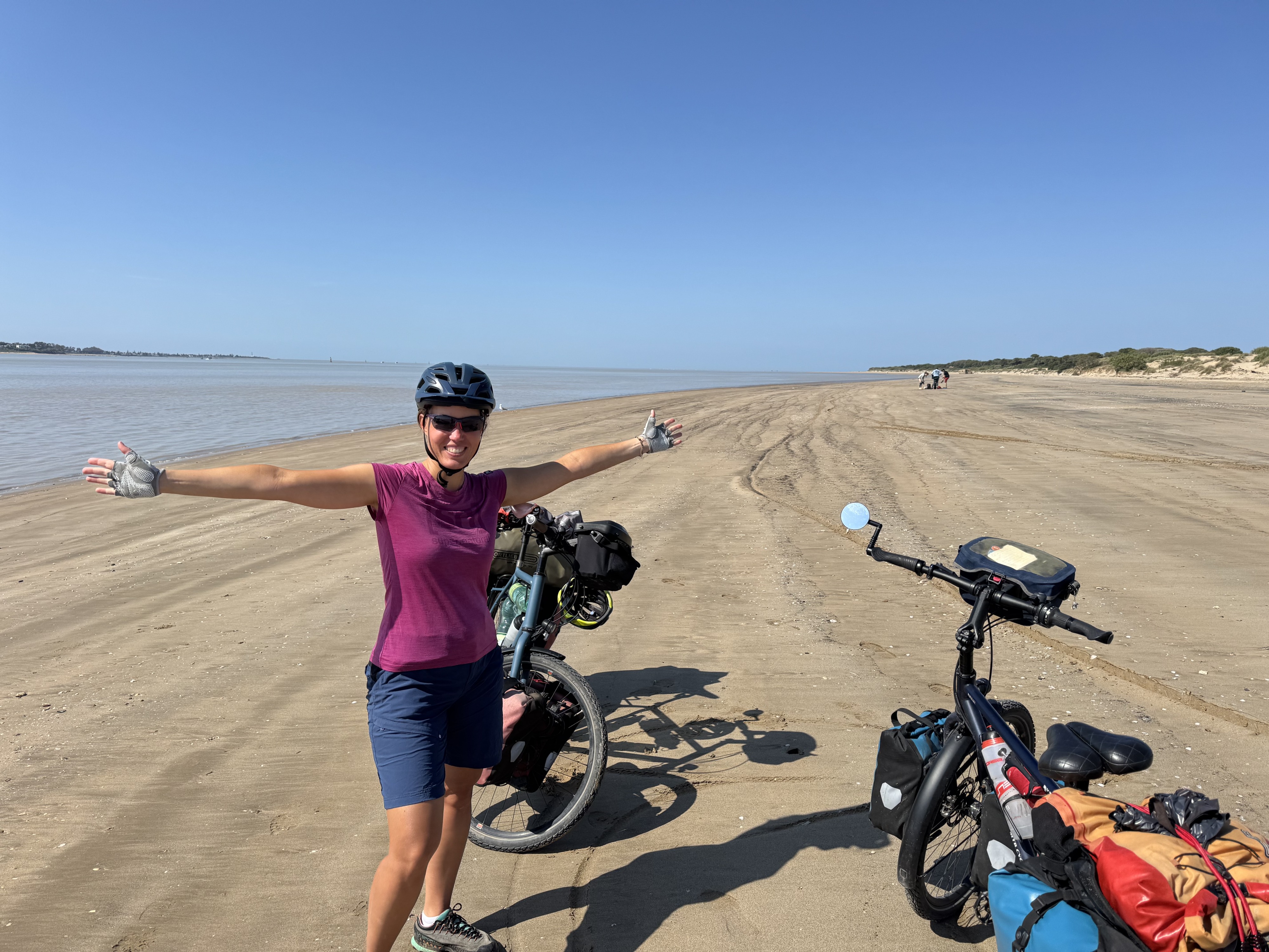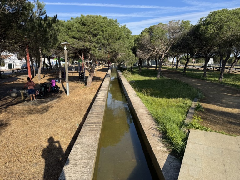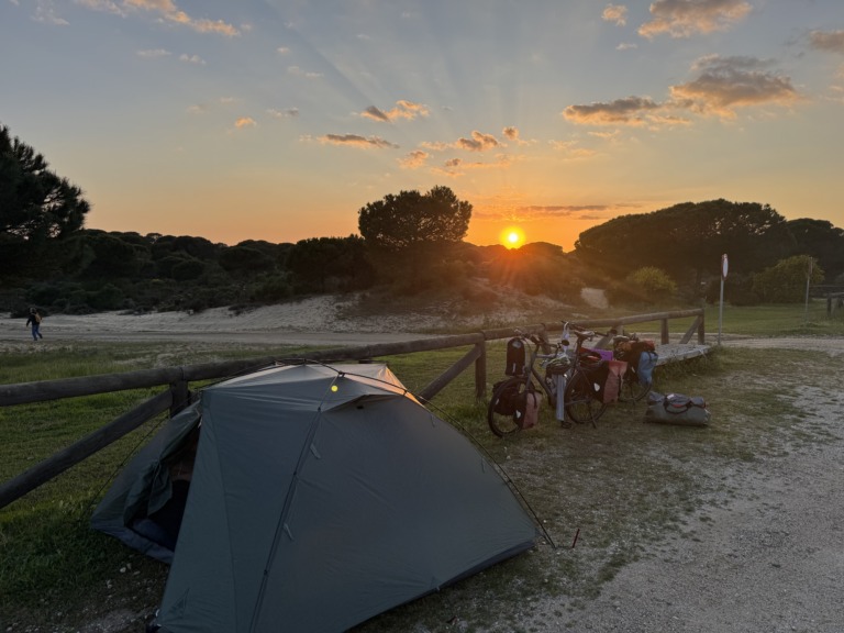 We arrive in Cádiz by ferry right on time at 8 a.m. Our rough plan is to first ride along the coast toward Portugal. However, we make our first stop in Chipiona, because just at that moment we receive a message from our Warmshower host saying that Beni’s air mattress has been delivered to him by mail 🎉😃! What a stroke of luck. After the handoff, we hit the road again right away: We decide to pitch our tent a few kilometers further on. Since we really need a shower, we head to the “Camping La Siesta de la Gaviota” campground.