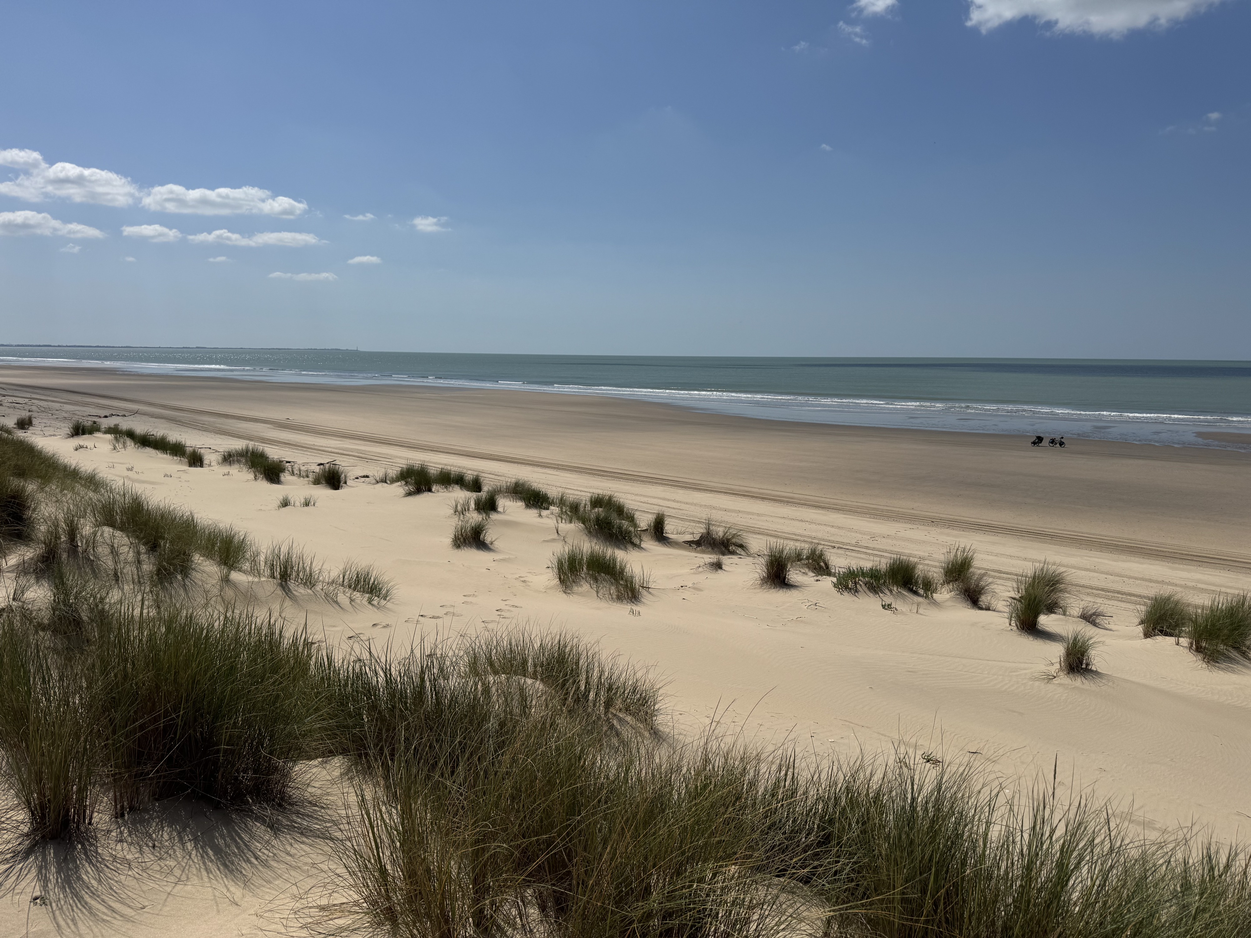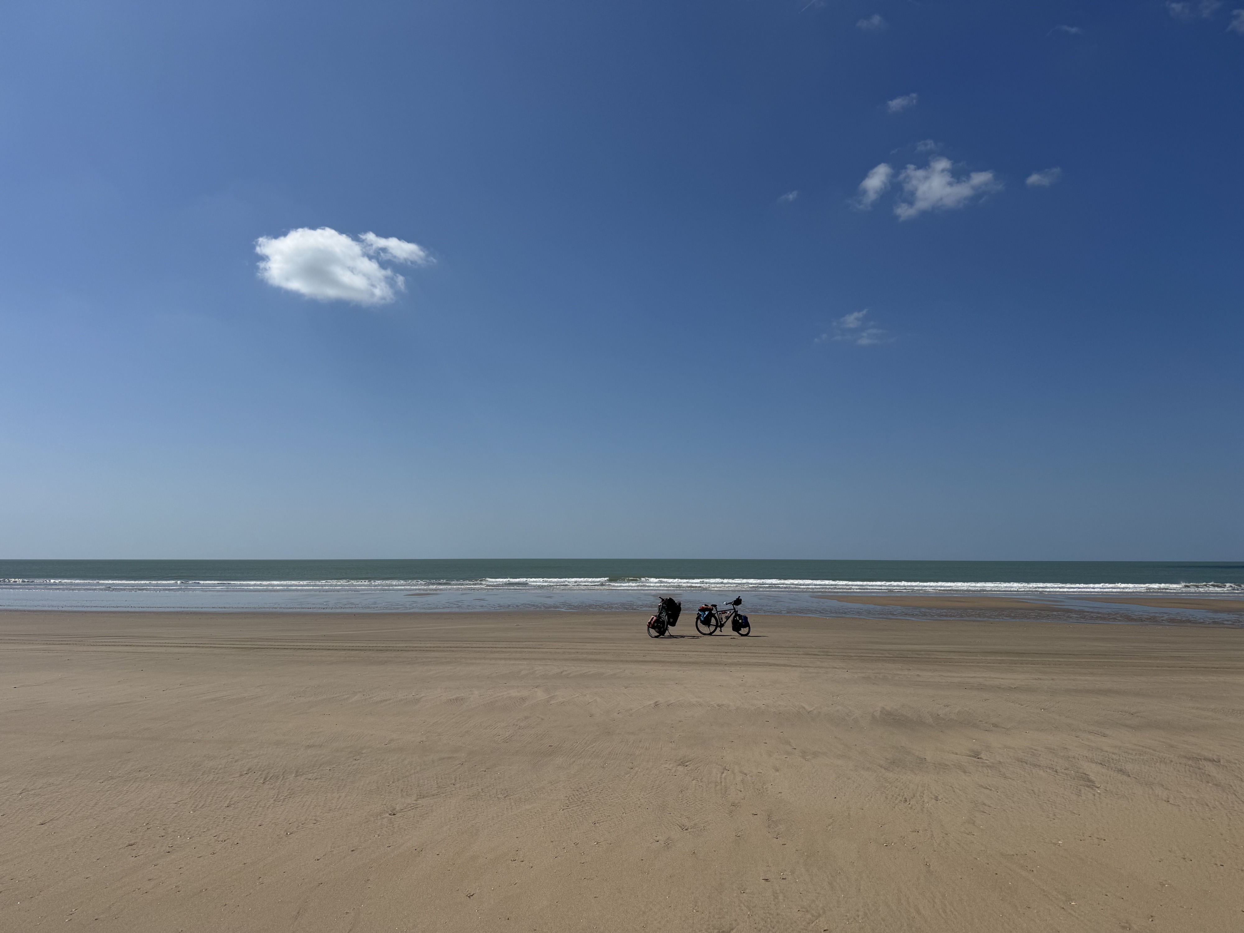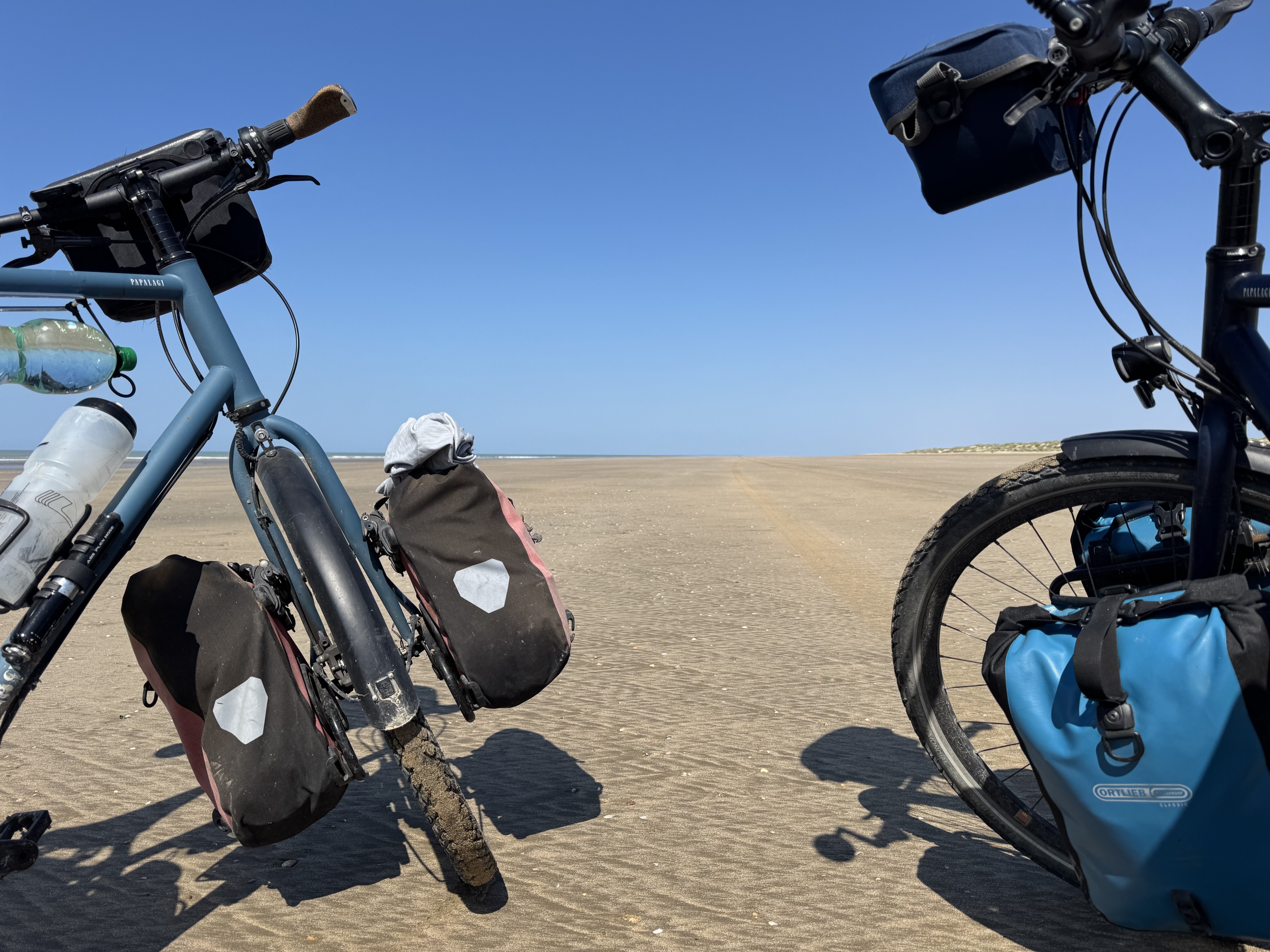 The first 15 km feel really good. We make good progress and enjoy the complete seclusion—just us and 30 km of sandy beach. About halfway through, however, the sand becomes softer in places, and the last few kilometers turn into a real challenge. At times, we have to push the bikes. Despite everything, it remains a unique experience. Only the occasional off-road tour buses passing by and the washed-up trash dampen the mood a bit.