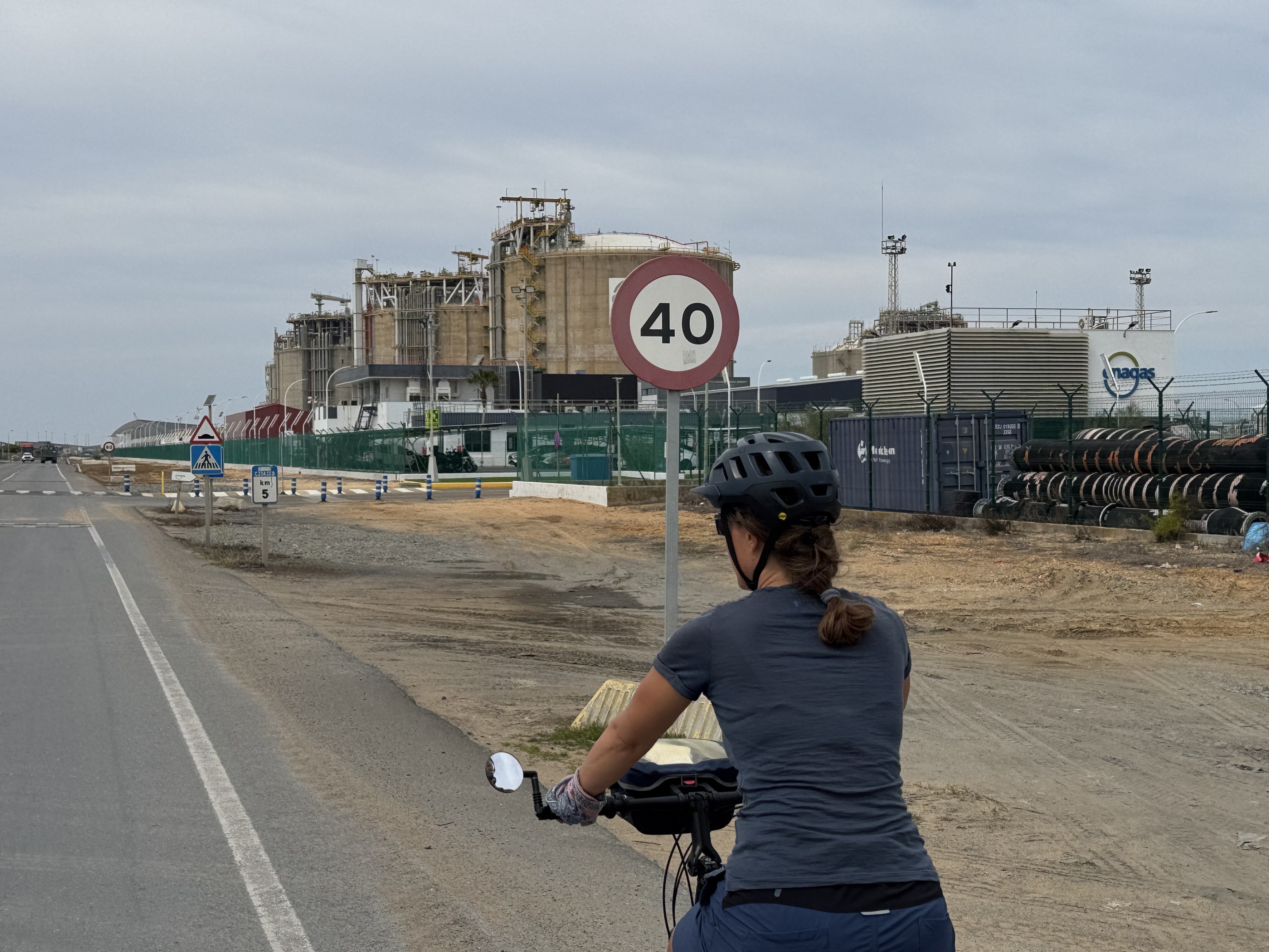 The next stretch, past the port of Huelva, is, on the other hand, rather unattractive. Everywhere there are huge industrial complexes, black smoke, and poor bike paths, some of which simply end at a heavily trafficked bridge where cycling is prohibited 🫣. Nevertheless, the city of Huelva also offers some beautiful views and buildings.