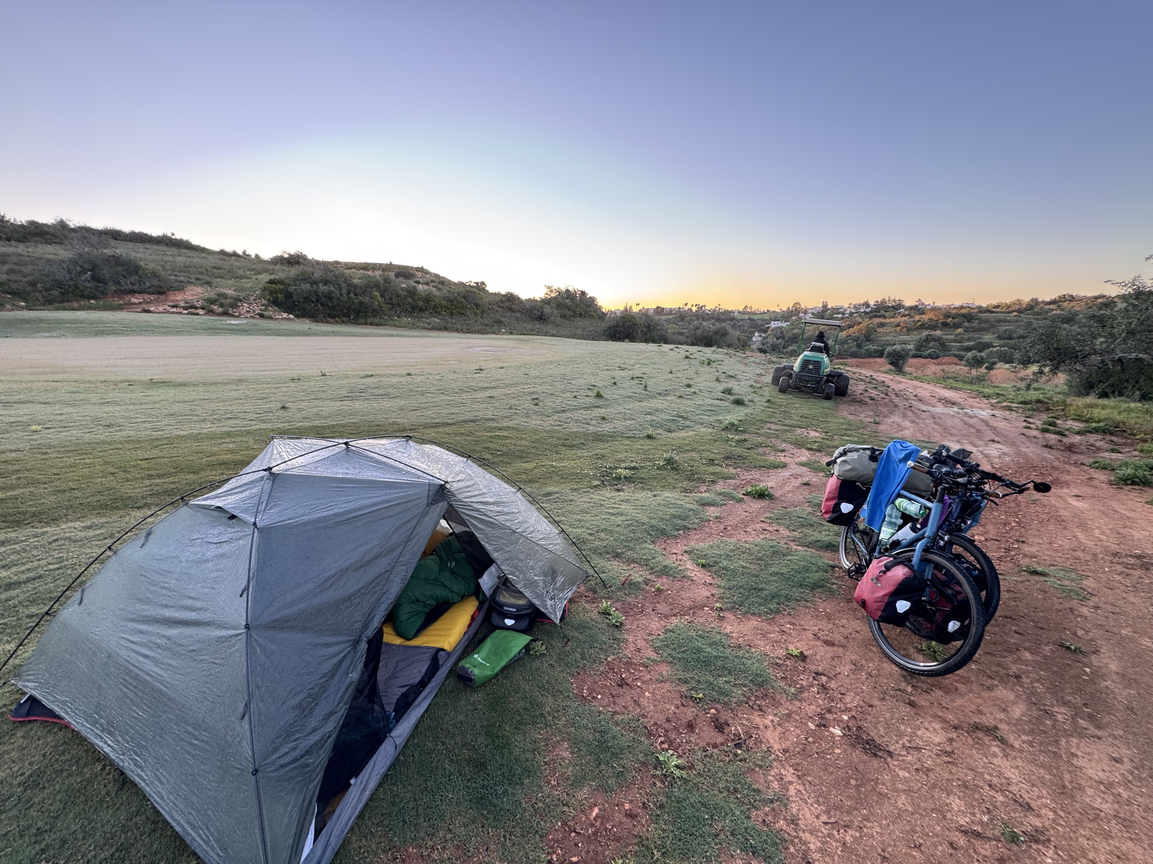In the evening, we set out again in search of a place to sleep. We discover a secluded road and follow it curiously all the way to the top—and suddenly find ourselves on what appears to be an abandoned golf course. The grass looks patchy, with small bushes growing everywhere. Perfect.