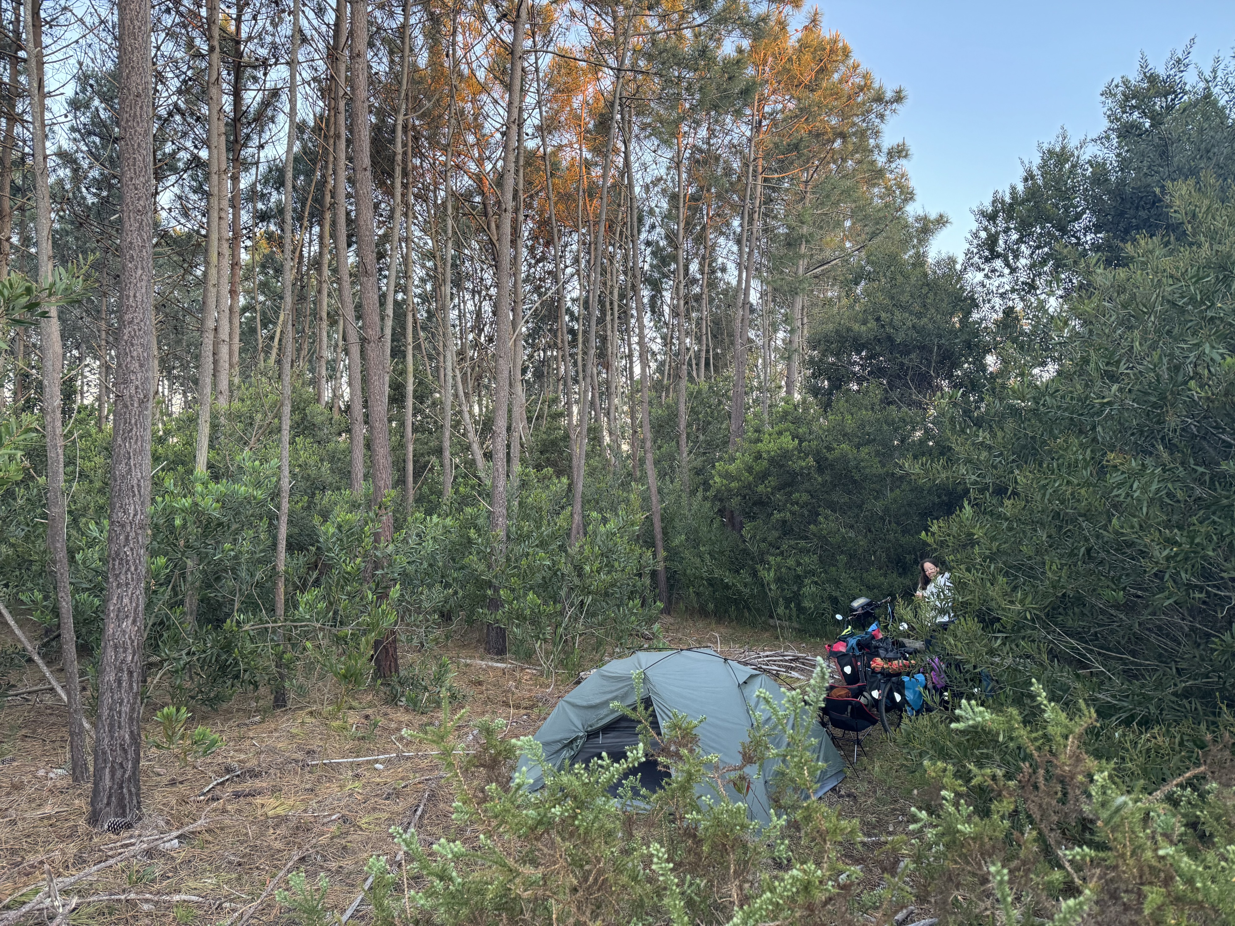 We often pitch our tents deep within wonderfully fragrant eucalyptus or pine forests, as hidden spots are otherwise rather scarce here. On the other hand, the EuroVelo route runs much more frequently right along the coast in this section, and we usually encounter hardly any traffic. We even venture into the ice-cold water twice 😃.