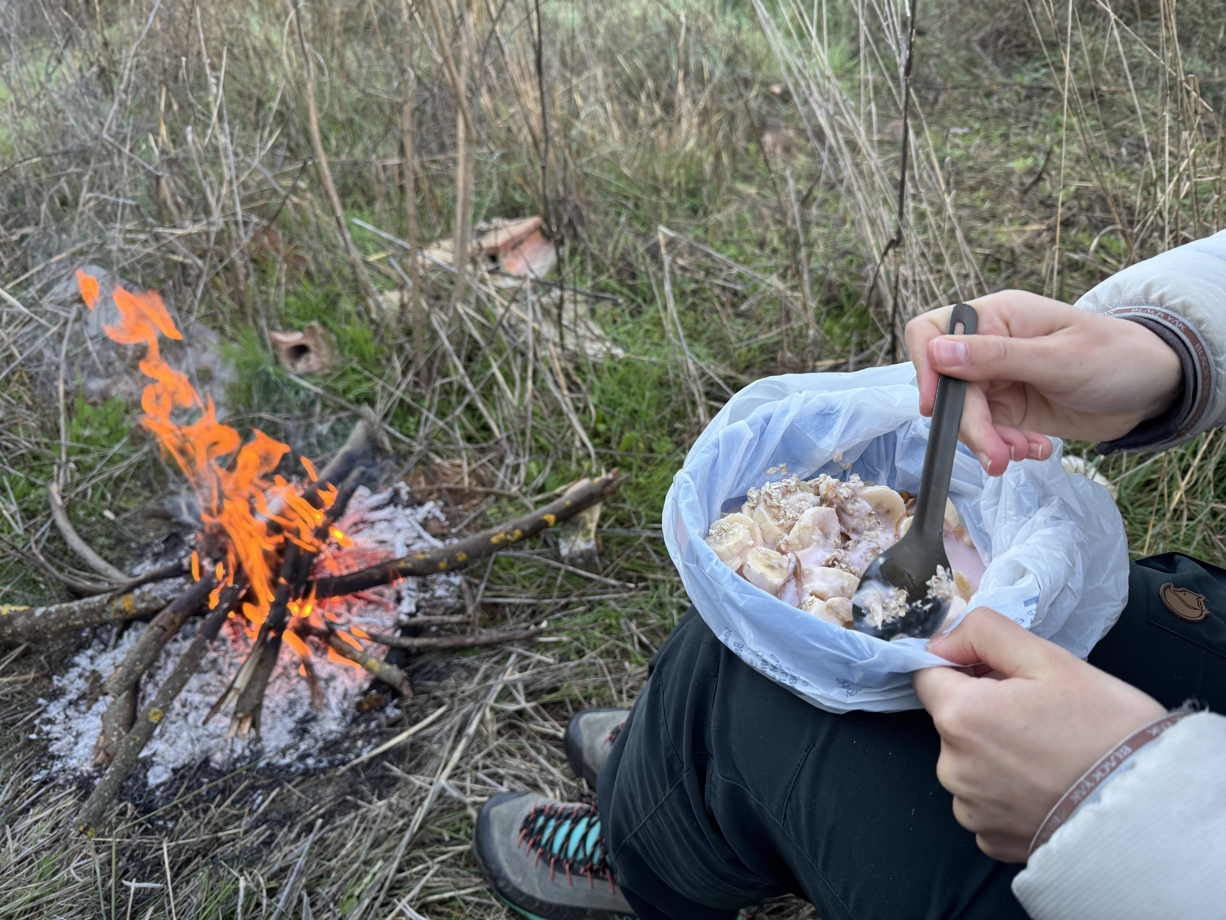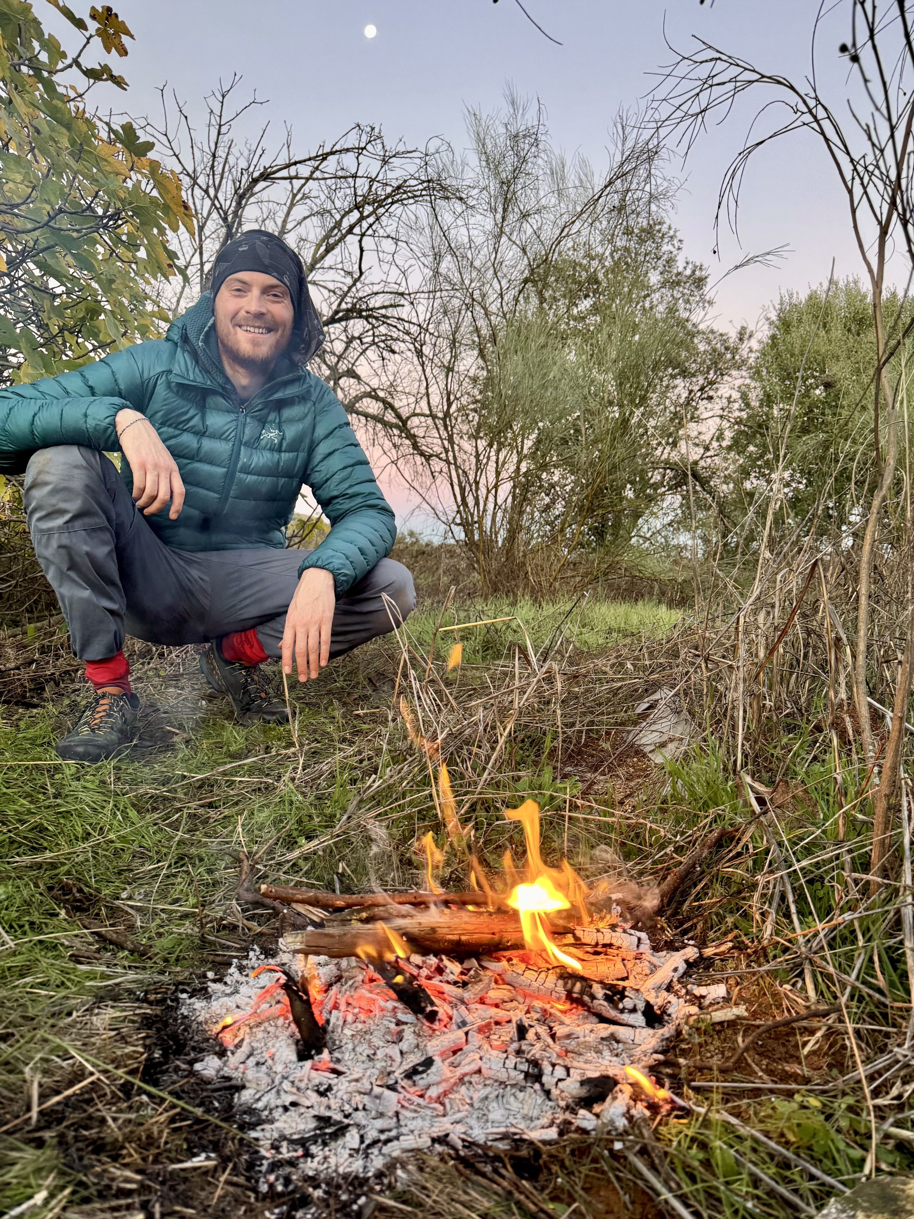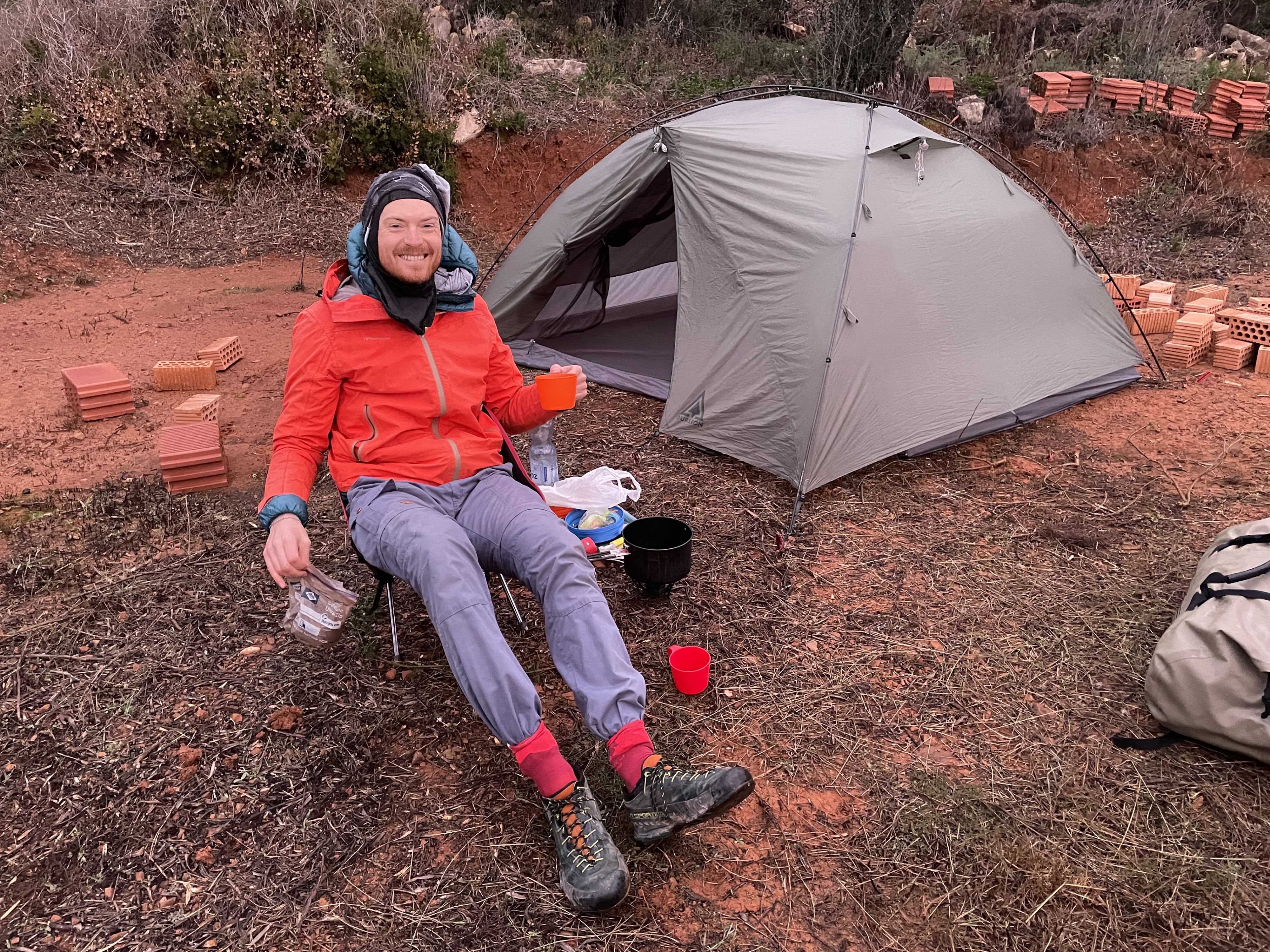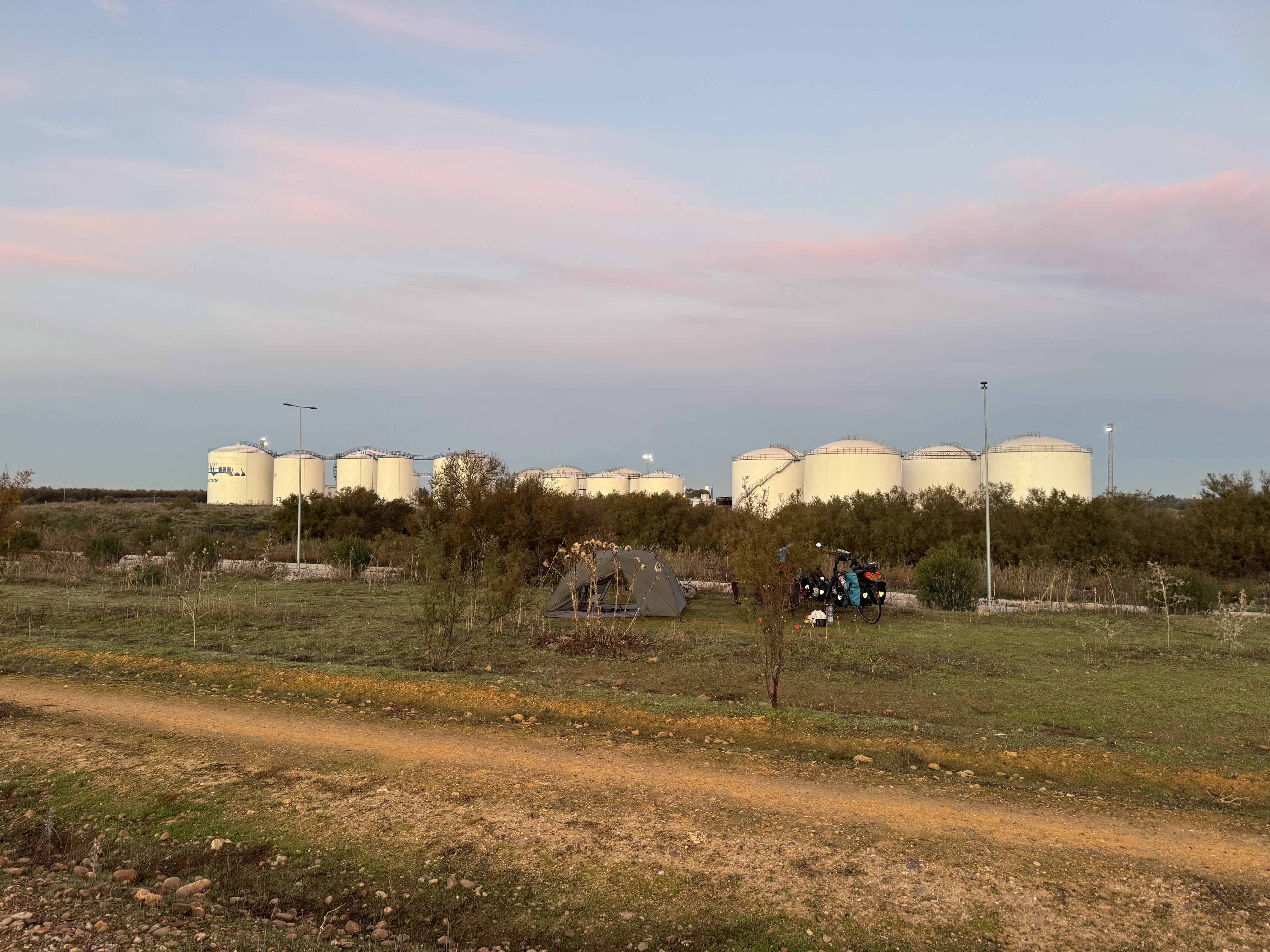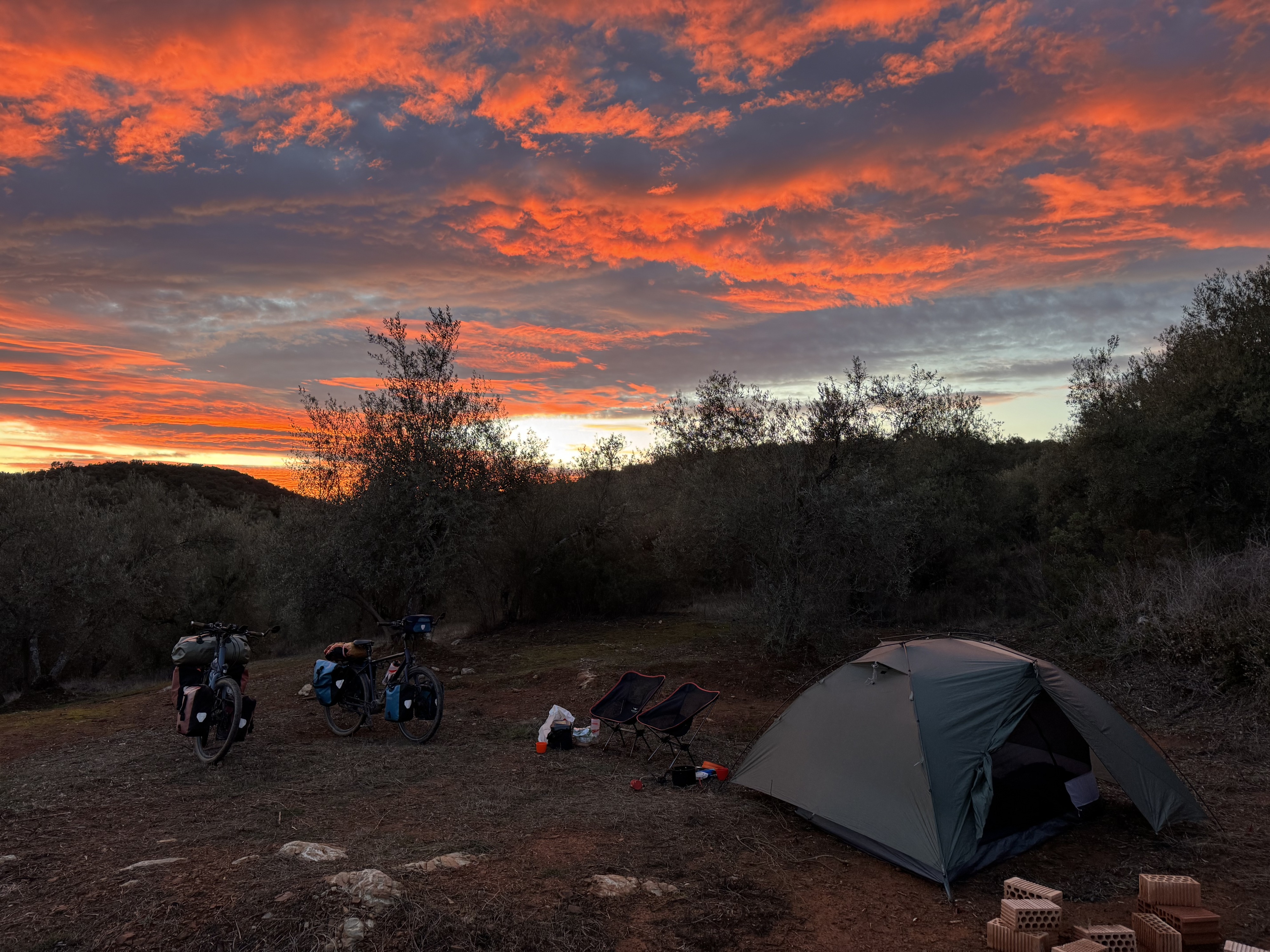 We pitch our tent again in the nature park, this time among olive groves. The sun sets with a beautiful evening sky—and disappears for the next few days.