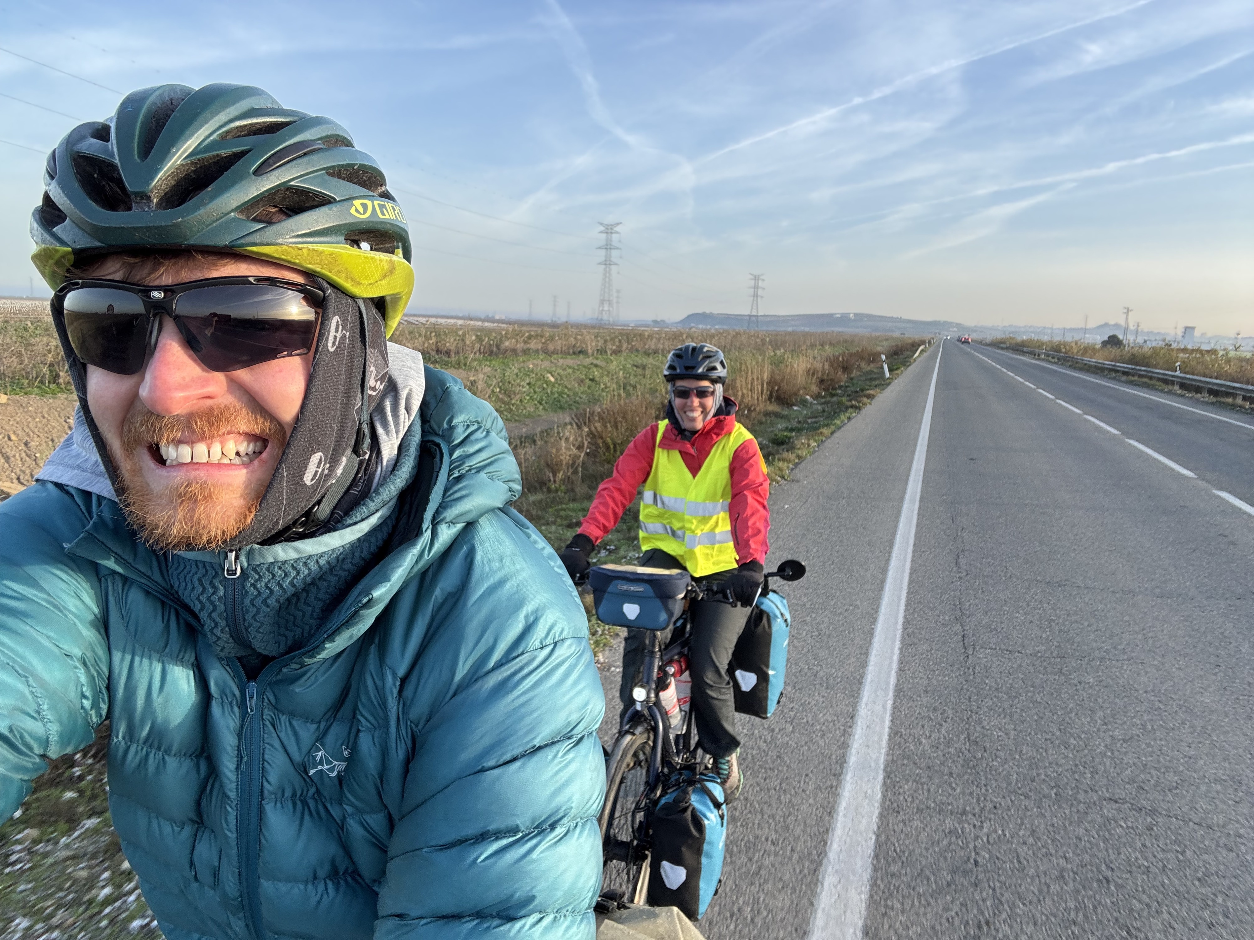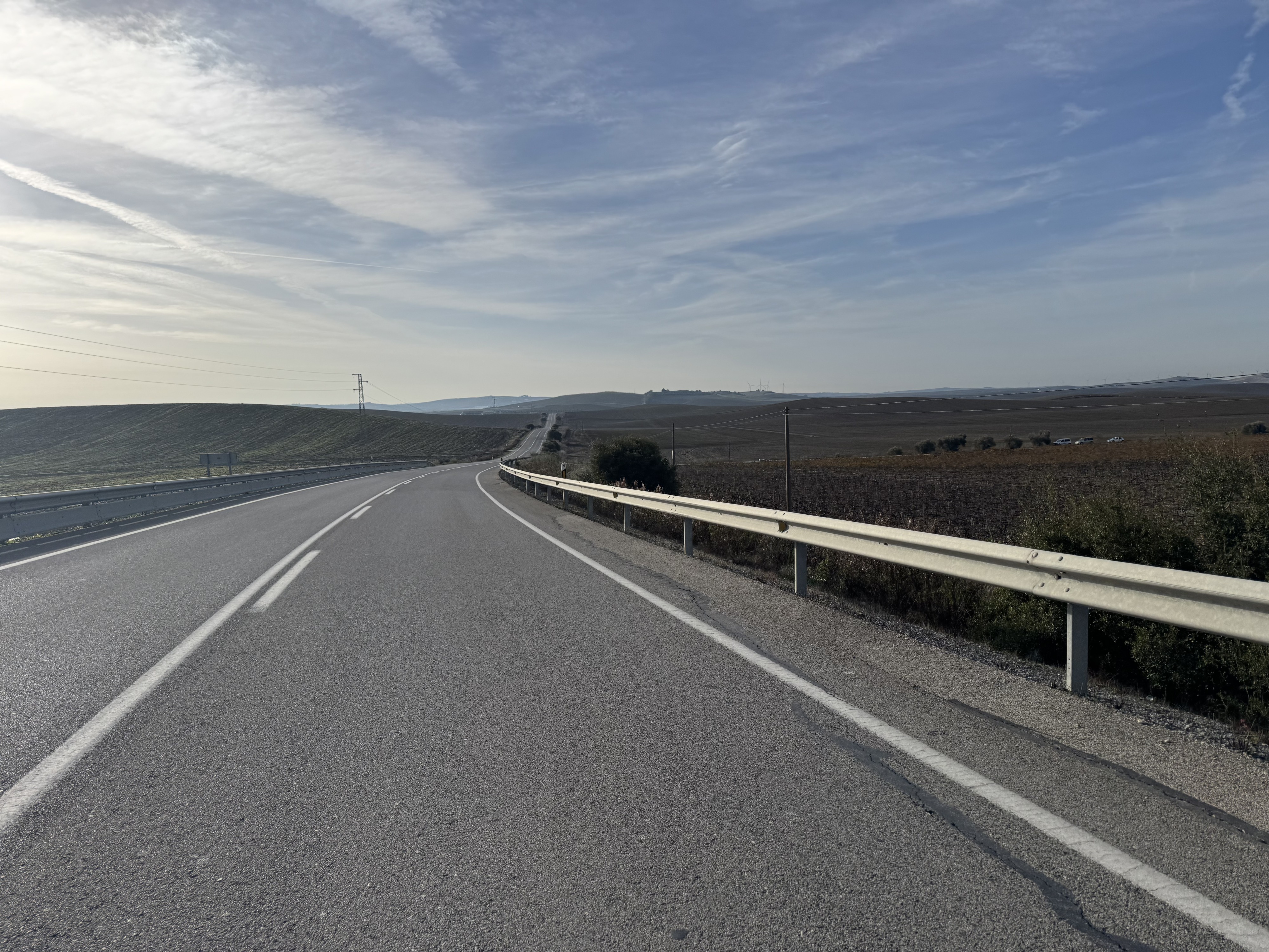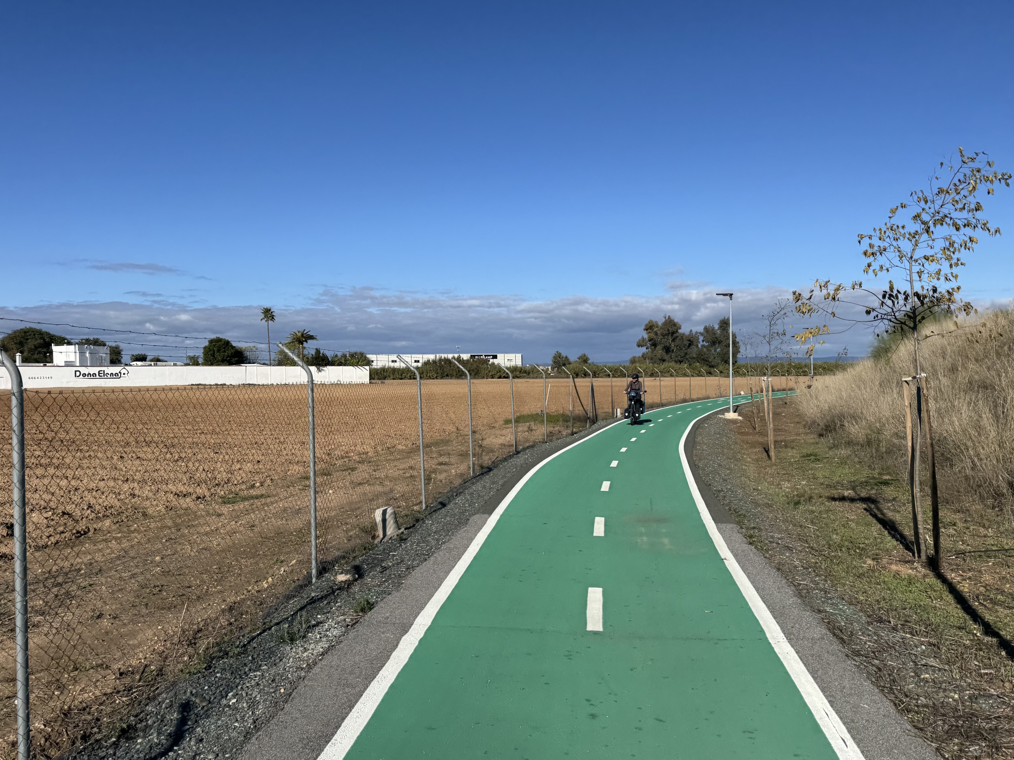 The rest of the journey to the south coast of Spain—via Seville and Jerez de la Frontera, among other places—was mostly through flat or gently rolling countryside. For miles on end, we rode through vast agricultural fields, accompanied by endless irrigation canals, interspersed with solar farms and the occasional small village.