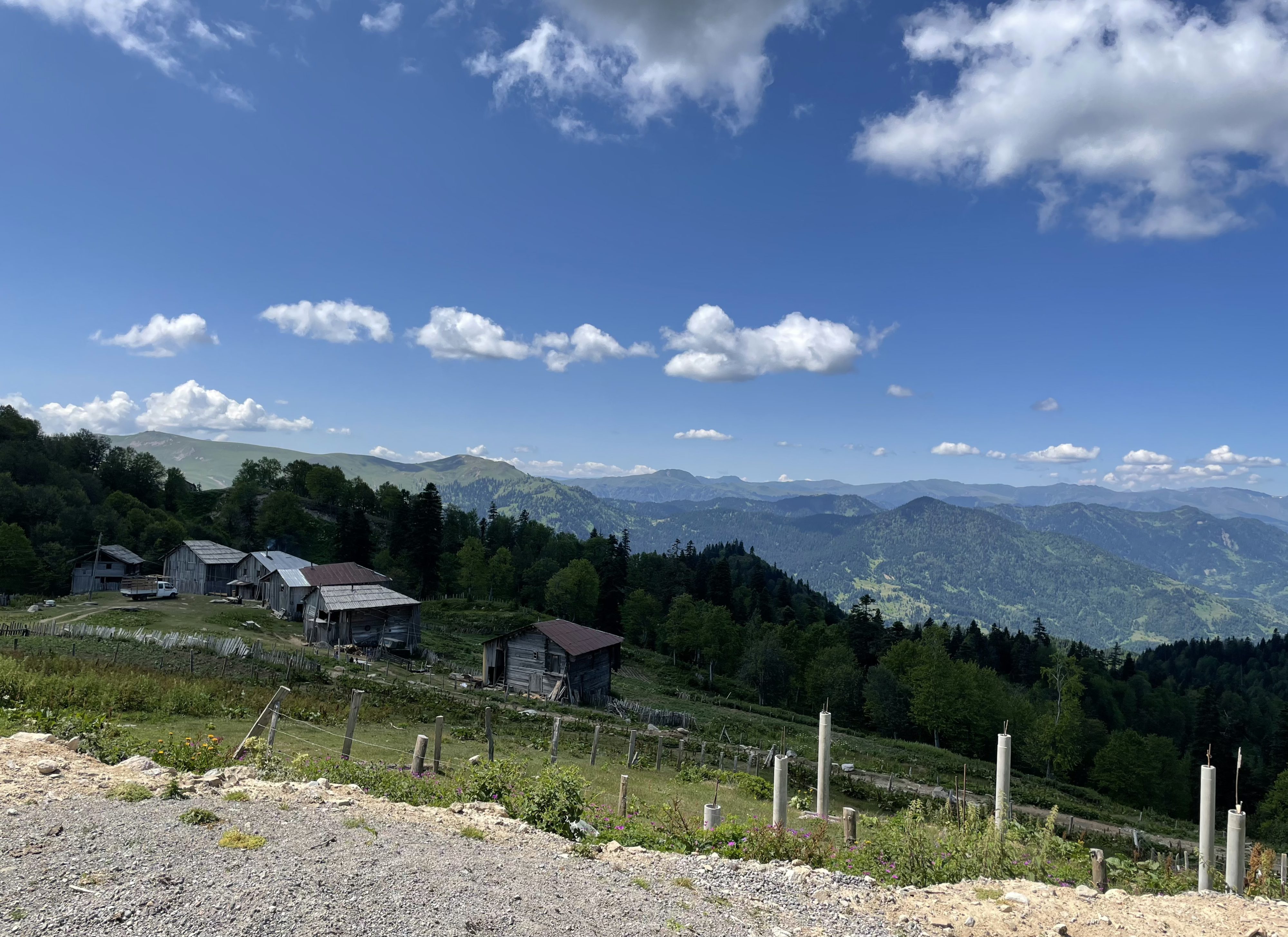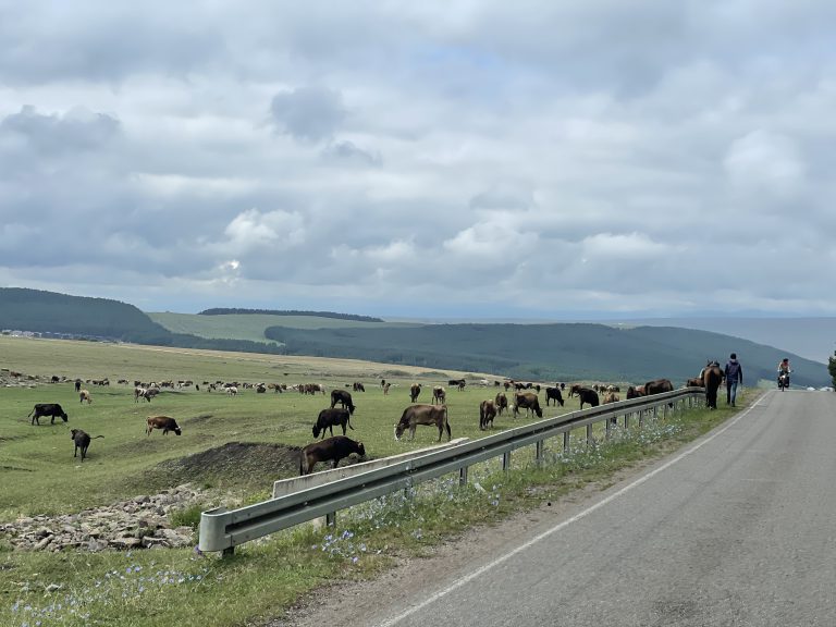 We gratefully accepted the offer and he picked us up on time at the agreed location. After a zig-zag ride past herds of cows, we arrived at his beautifully situated Guest House. A deliciously laid table full of Georgian specialities, including a gigantic jug of wine, was waiting for us. With our bellies full and the jug empty, we set off for the hot spring.