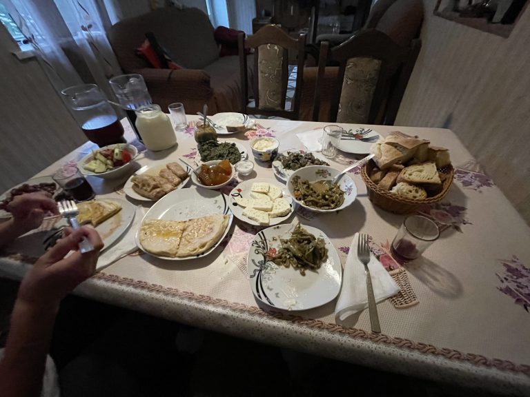 By chance, we met Gocha during our tour, a tour guide who was taking a break. After a short conversation, he inquired if we already had a place to stay for the night, since he runs a guest house with his wife on the side. We said yes, whereupon he made us a suggestion: he would pick us up at our accommodation after work and take us to his home for dinner. They had good wine and his wife was an excellent cook. Moreover, he knows a secret hot spring where you can bathe. He would like to show us this place as well and then drive us back home. All in all, it should only cost 70 GEL (Georgian lari, approx. 20 CHF).