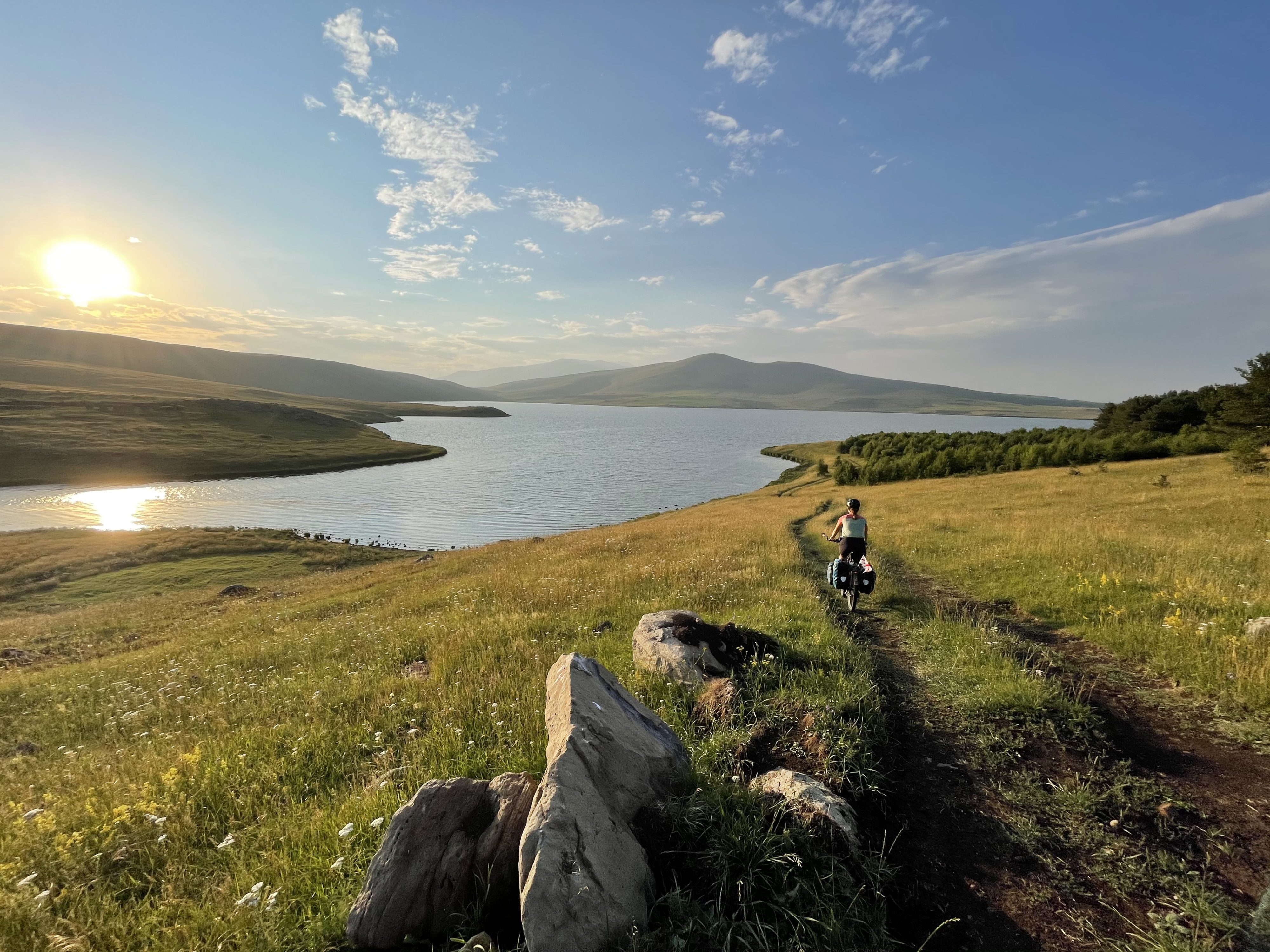 The steppe landscape continued for a while. Later we followed a road with little traffic and three very beautiful lakes. We camped at two of them. At one, just before Tbeti, we were approached on the street by a Frenchman who runs a hostel nearby and inquired about our place to stay. Since we still had no plan (as usually), he said, we should go to his hostel and already put up the tent there, he would then join us after his shopping. There would also be a barbecue in the evening. We gratefully accepted the invitation.