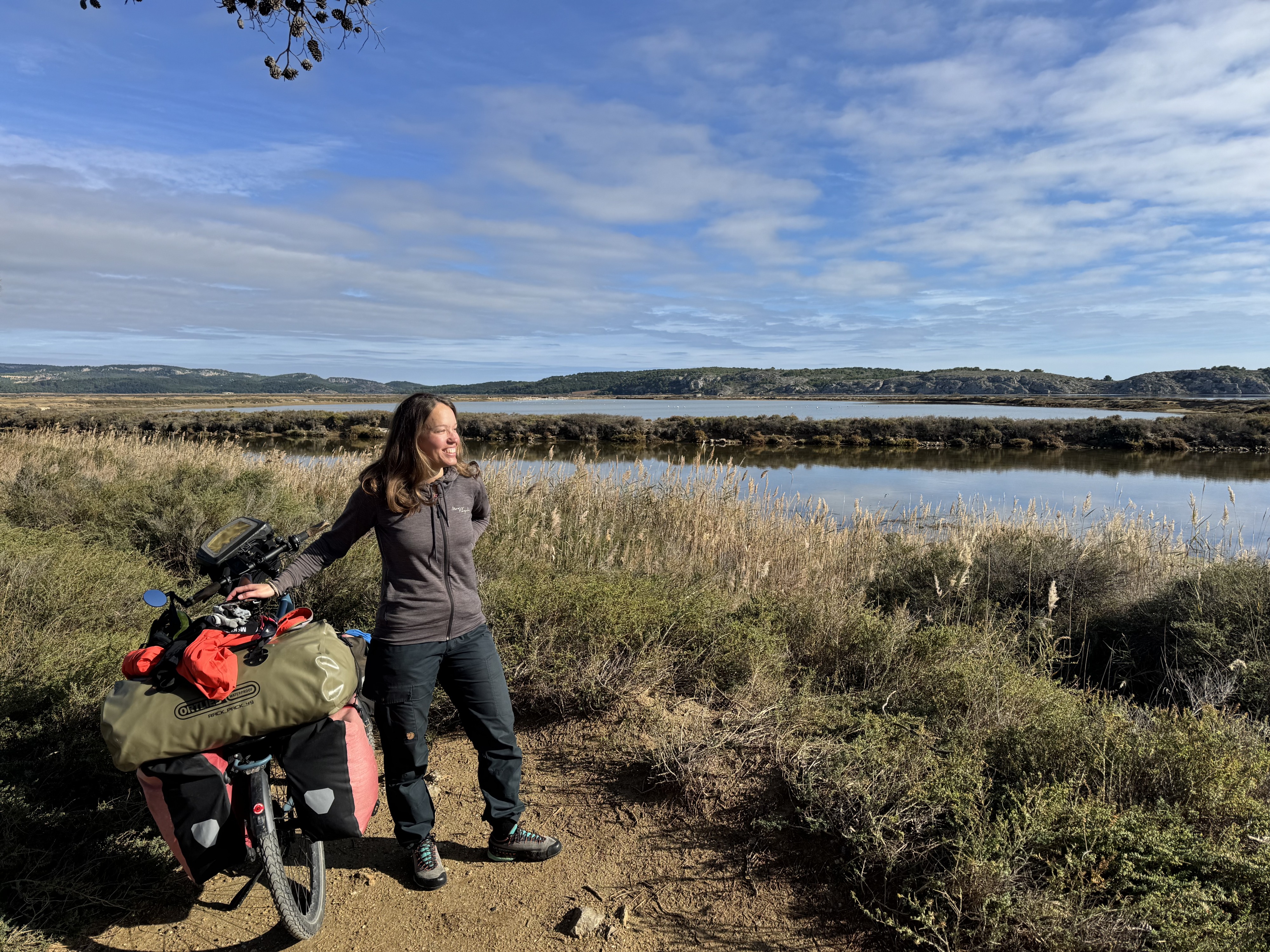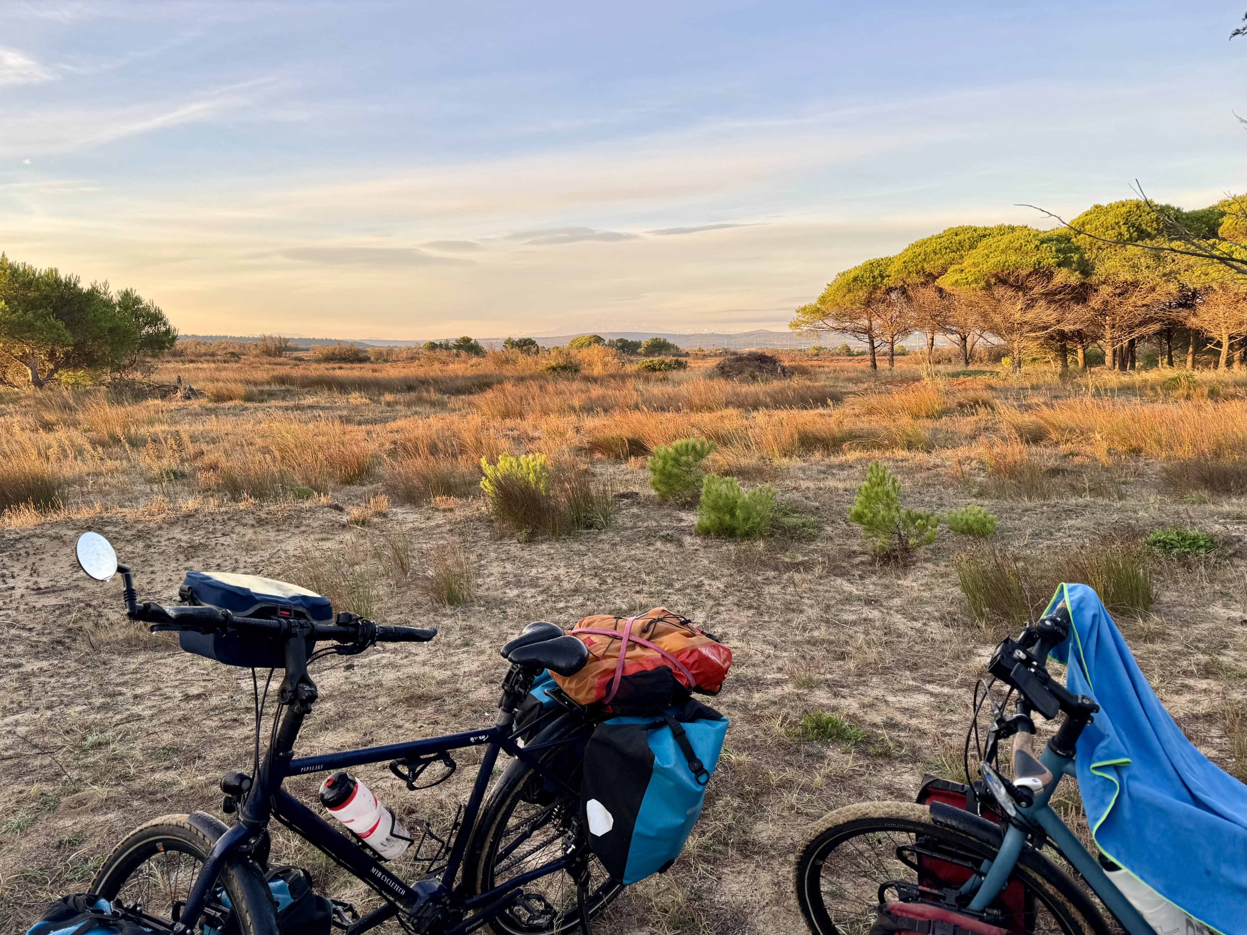 Obwohl wir am nächsten Morgen früh starteten, machten sich die 50-km/h-Böen schon bald bemerkbar. Immerhin hatten wir in Saintes-Maries-de-la-Mer noch einen geöffneten Campingplatz ausfindig gemacht. Dort fanden wir einen windgeschützten Zeltplatz – und eine Dusche war nach den letzten Tagen auch dringend wieder einmal nötig!