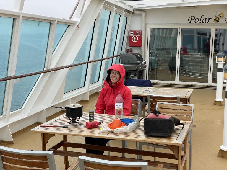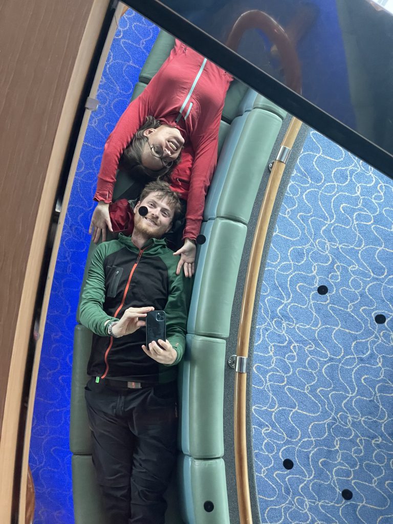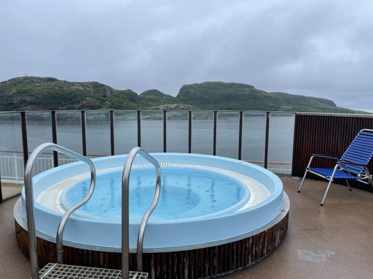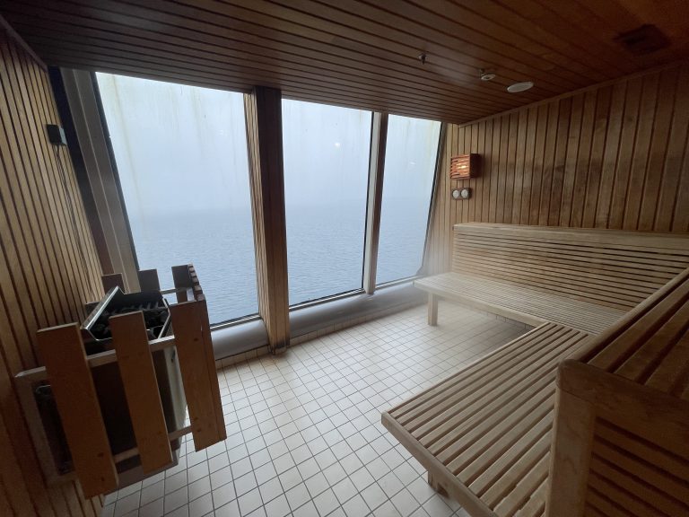 Auf unserer Erkundungstour entdecken wir unter anderem eine Sauna mit Panorama-Fenster, eine Kaffeemaschine mit gratis Kaffee (für Beni sehr wichtig 😊), bequeme Sitzmöglichkeiten mit Aussicht und zu guter Letzt zwei Whirlpools auf dem Schiffsdeck 😍!