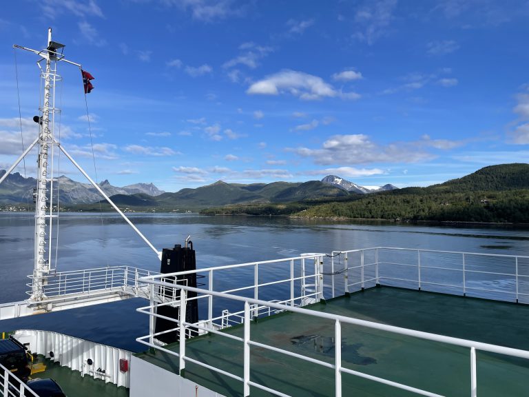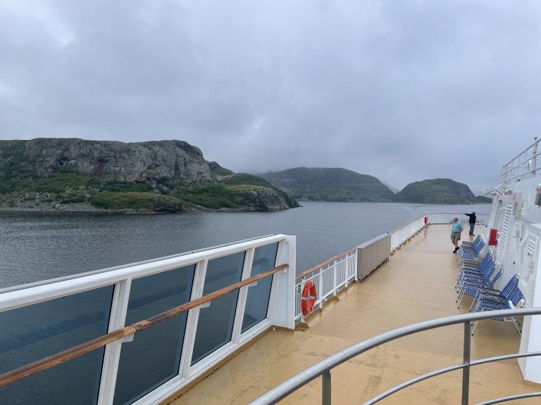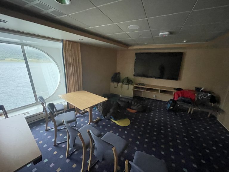 Bei diesen Möglichkeiten und der spektakulären Aussicht verstreichen die Stunden wie im Flug. Es wurde Zeit für die Schlafplatzsuche, denn reist man weniger als 23 Stunden, braucht man keine Kabine. So machten wir es uns in einem kleinen, in der Nacht nicht benutzten, Konferenzsaal gemütlich und versuchten noch ein paar Stunden zu schlafen, denn unser Schiff sollte um 6 Uhr morgens in Nesna andocken.