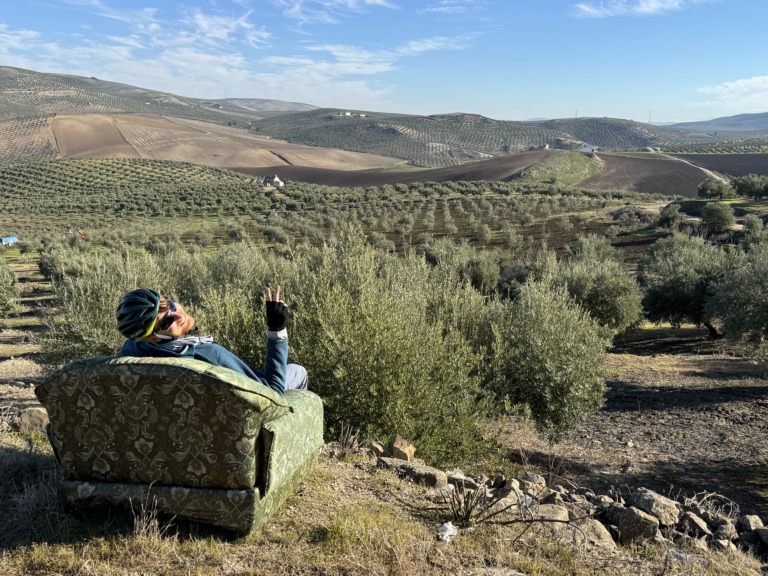 Der ganzen Olivenbaum-Monokultur zum Trotz haben wir die Weiten, die Farben der Hügel und die unglaubliche Ruhe auf dem Veloweg weiter Richtung Córdoba genossen. Es gibt eigentlich nichts Einfacheres als in dieser Umgebung einen guten Zeltplatz zwischen den Olivenbäumen zu finden, wäre da nicht gerade die Haupterntezeit 😊. So mussten wir schauen, dass wir in alle Richtungen mehr oder weniger nicht gesehen werden und uns dort niederliessen, wo bereits geerntet wurde. Die Bauern sind bei den noch nicht abgeernteten Bäumen eher vorsichtig, weil es öfters in der Nacht kriminelle Banden gab, welche grosse Mengen Oliven gestohlen haben. Allein in Andalusien verschwanden nach Schätzung der Polizei in der winterlichen Erntesaison 2023/2024 mehr als 500.000 Kilo Oliven von den Feldern. Deswegen überwachen die Bauern inzwischen mit Drohnen, Nachtsichtgeräten und Hubschraubern die Anbaugebiete.