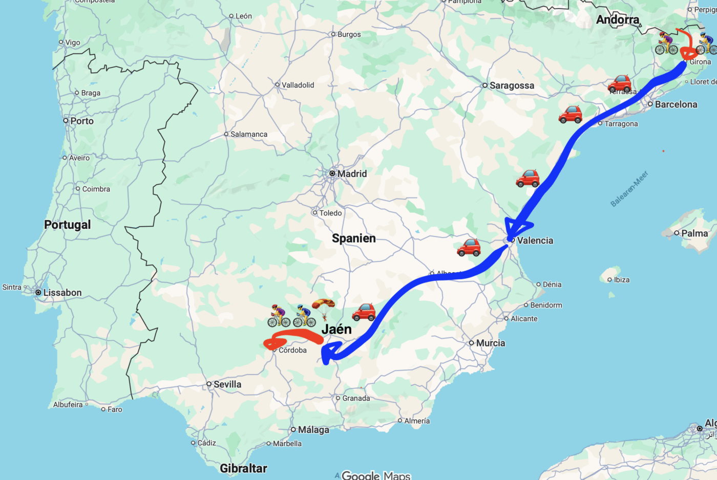 Schnell war klar, dass wir nicht die ganze Strecke quer durch ganz Spanien mit dem Velo schaffen würden – wir sind spät gestartet und wurden dann auch noch krank. Also überlegten wir uns, wie wir von Girona am besten „abkürzen“ könnten, um möglichst weit in den Süden Spaniens zu gelangen und somit als zusätzlichen Pluspunkt auch wieder mehr in die Wärme. Der Zug wäre unser Favorit gewesen, aber auf den brauchbaren Verbindungen werden keine Velos mitgenommen oder nur verpackt in einem Karton. Per Flixbus wäre ebenfalls ideal, doch im Winter transportieren sie keine Velos, da die Nachfrage zu gering sei. Dass sie dafür das ganze Trägersystem abbauen und auf zusätzliches Geld verzichten, ergibt für uns zwar wenig Sinn, aber irgendein Ökonom wird da schon richtig kalkuliert haben 😅. Fliegen war ebenfalls keine attraktive Option mit unseren Velos.