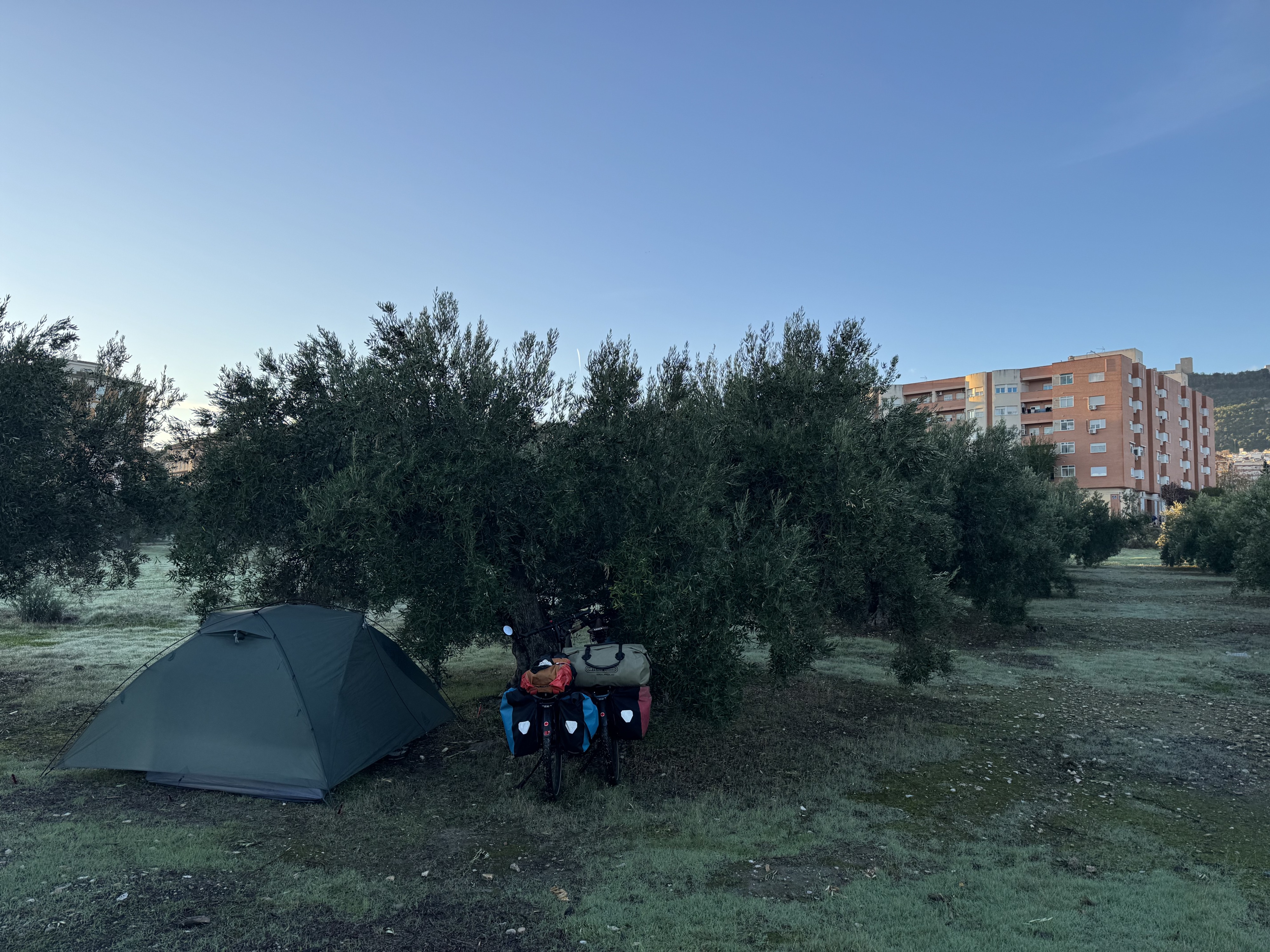 Dort standen wir nun, im Dunkeln, inmitten dieser Stadt mit 112’000 Einwohnern. Wie zwei Zombies setzten wir uns in den erstbesten Park und kochten unser Essen für die ganz harten Zeiten: Pasta mit Tomaten-Sauce 😅. Danach liefen wir ein paar Meter weiter und stellten unser Zelt unter dem nächstbesten Olivenbaum auf. Spoiler: Das wird nicht der letzte Olivenbaum gewesen sein.