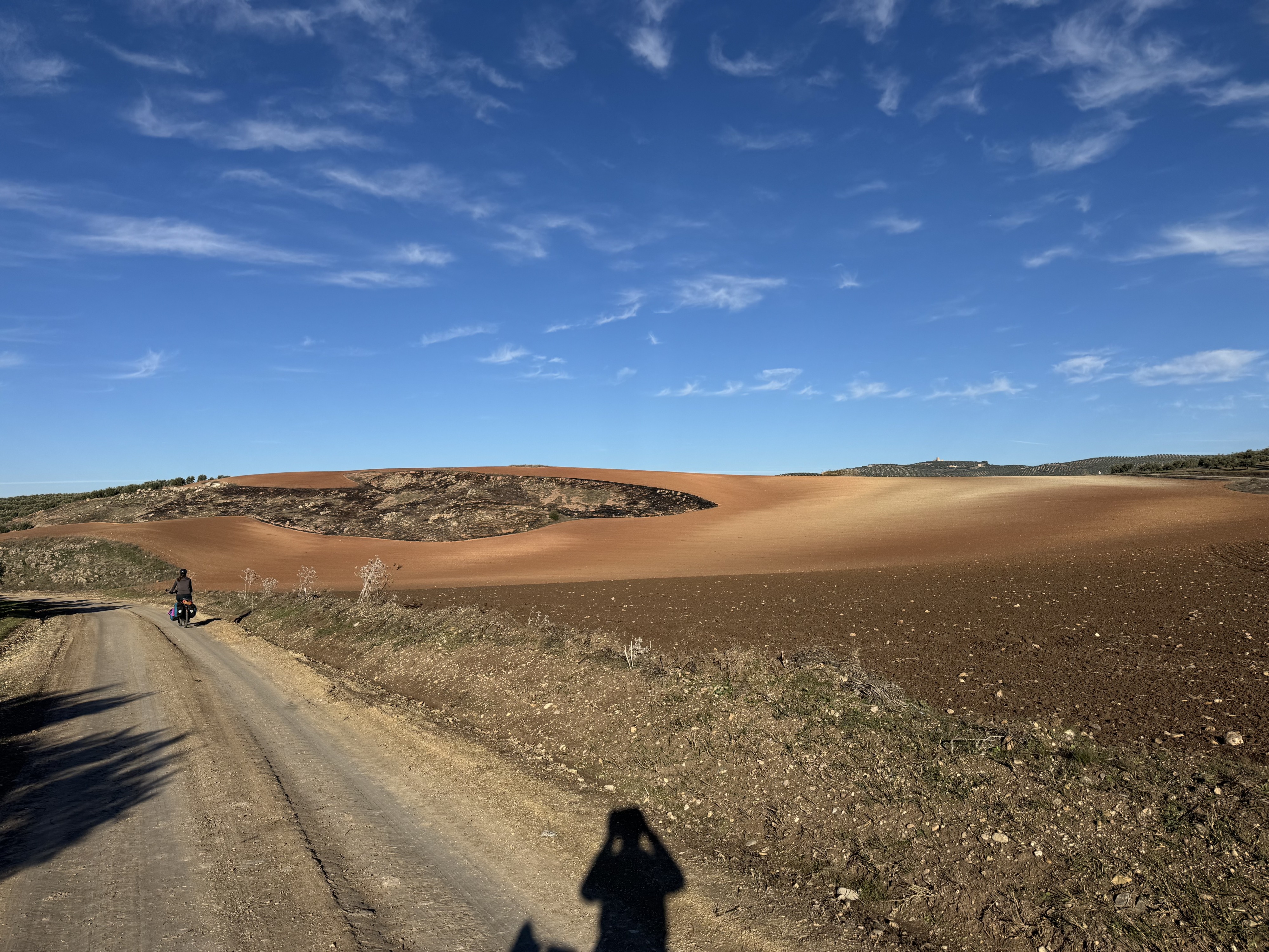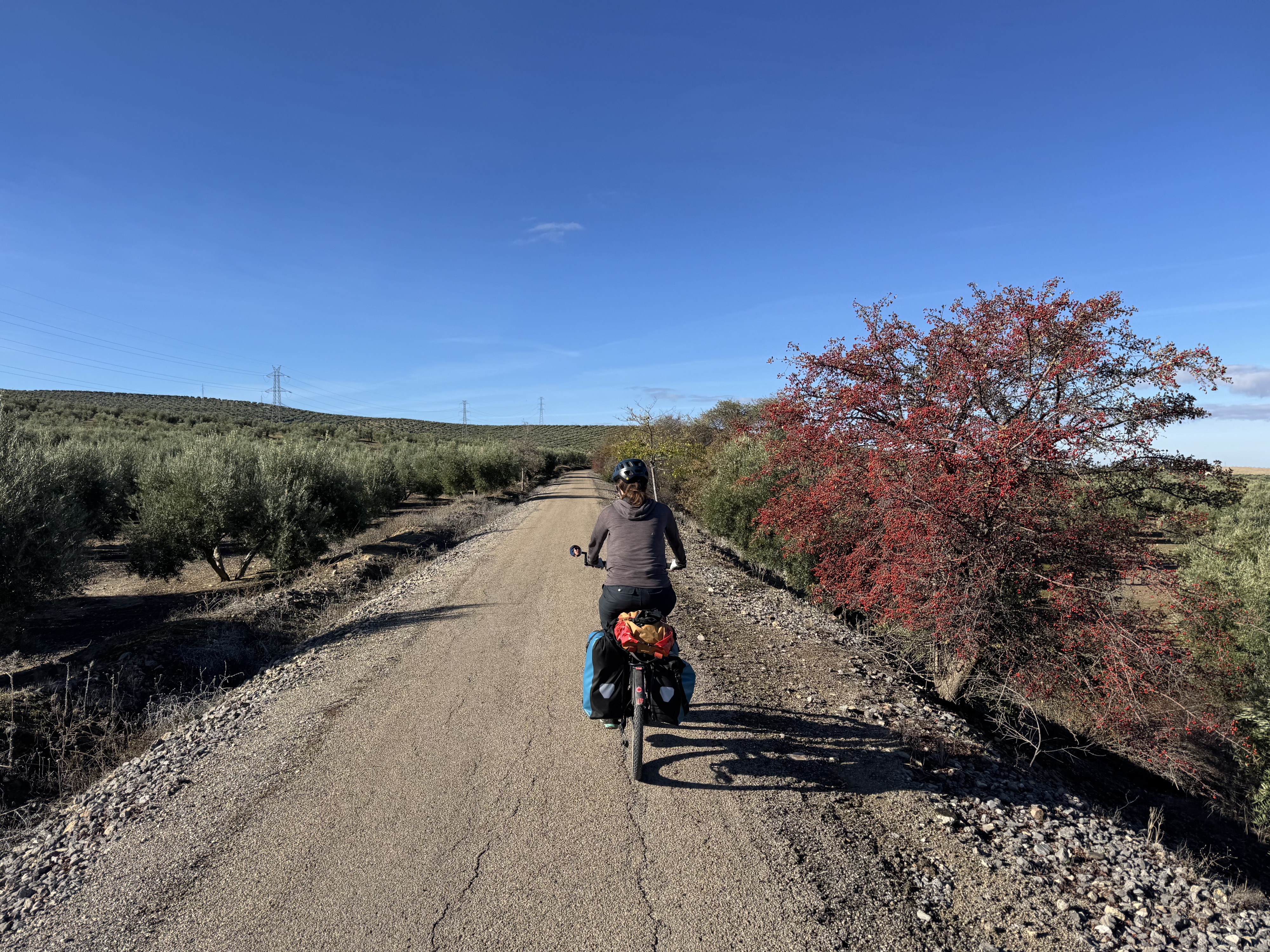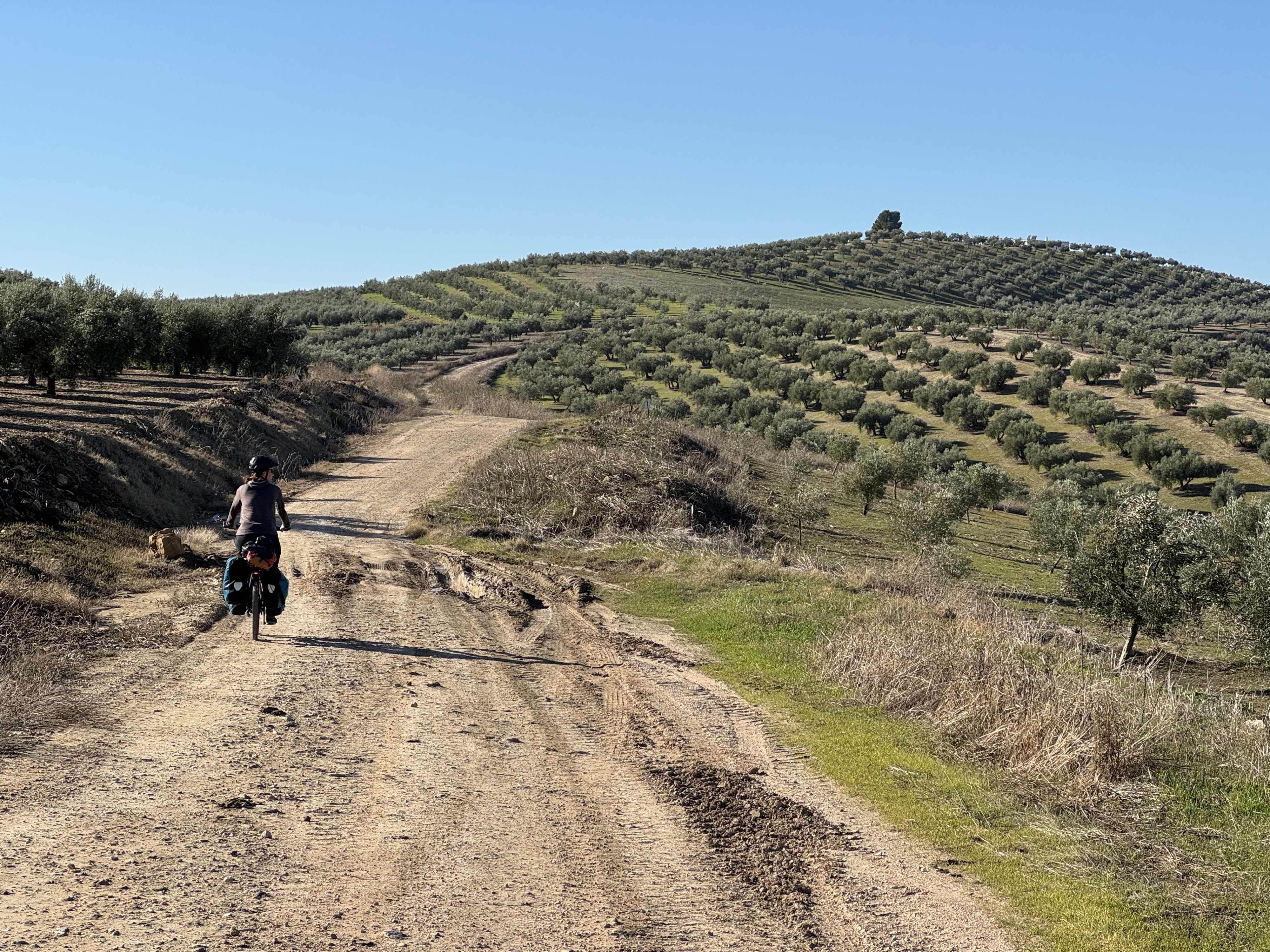 Ab Jaén folgen wir hauptsächlich dem European Divide Trail, einer Bikepacking-Route bis nach Cádiz. Dort werden wir am 13.12. die Fähre auf die Kanaren nehmen. Gleich hinter Jaén führte uns ein erstaunlich gut gepflegter Gravel-Veloweg mitten durch die Olivenplantagen Richtung Martos – direkt ins Herz der Olivenölproduktion. Erst als wir die ersten Höhenmeter geschafft hatten, wurde uns klar, wie unglaublich gross diese Plantagen sind. Mit etwa 175 bis 200 Millionen Olivenbäumen in Andalusien stammen schätzungsweise rund 30–36 % des weltweiten Olivenöls von hier. Egal wohin wir blicken: Am Horizont stehen immer Olivenbäume.