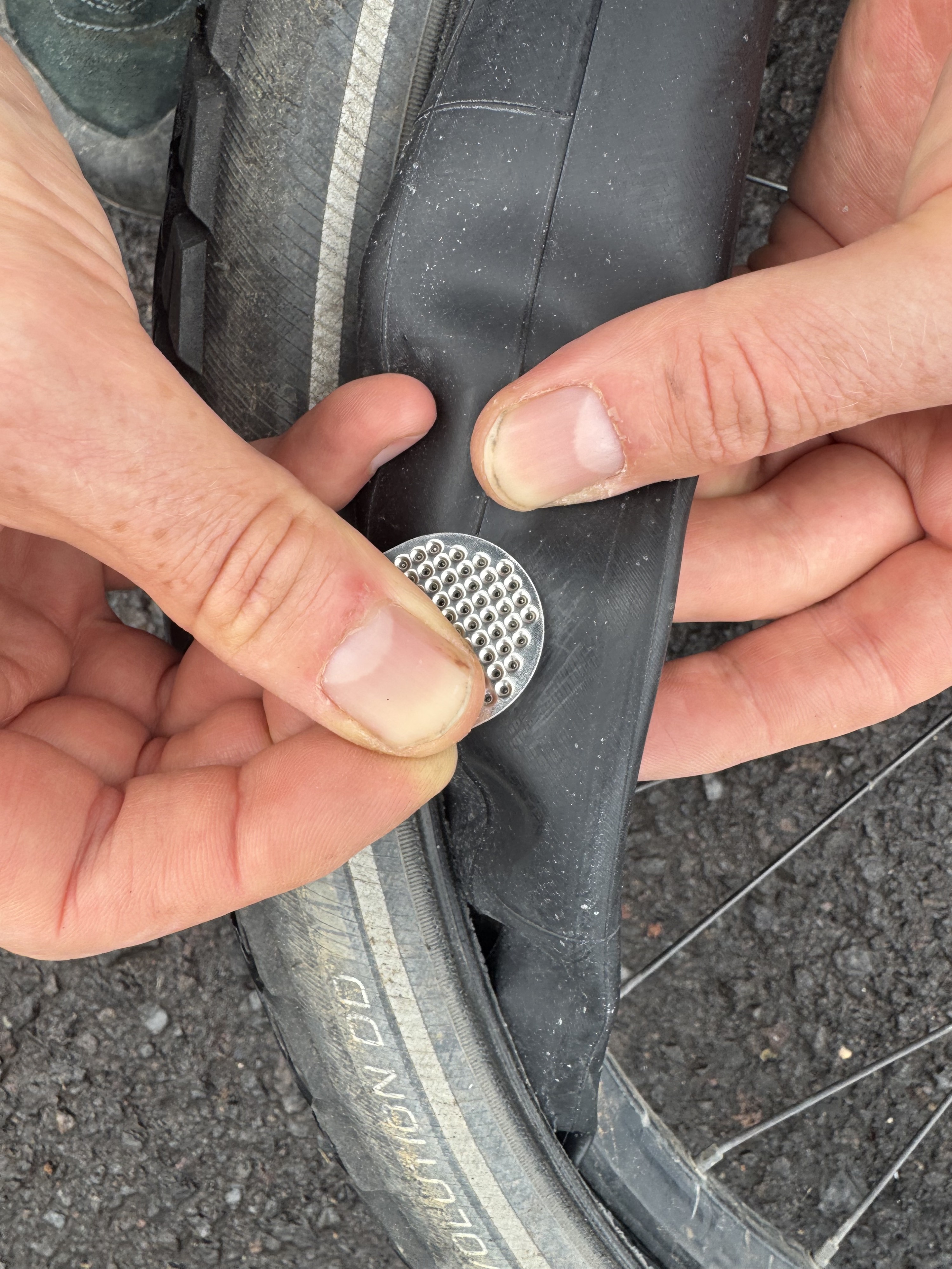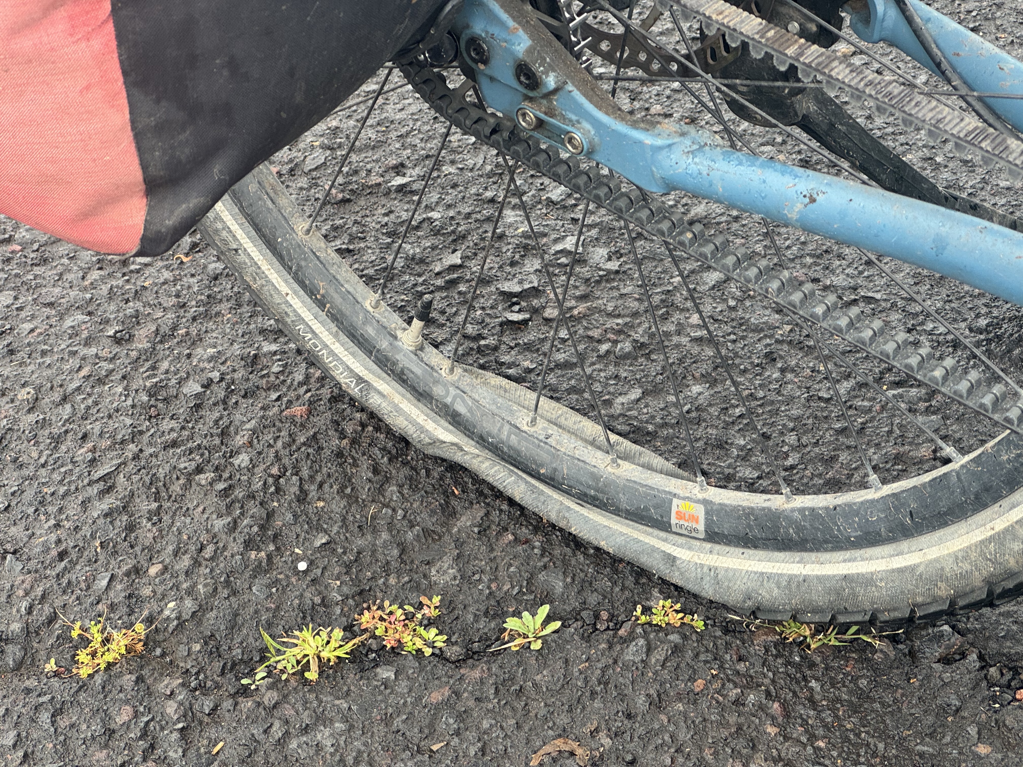 Kurz vor dem Camping passiert es dann: unser erster Platten. Doch das Loch ist schnell geflickt, und die Stimmung bessert sich schlagartig, als uns ein Einheimischer kurzerhand ein ganzes Bund Bananen schenkt.